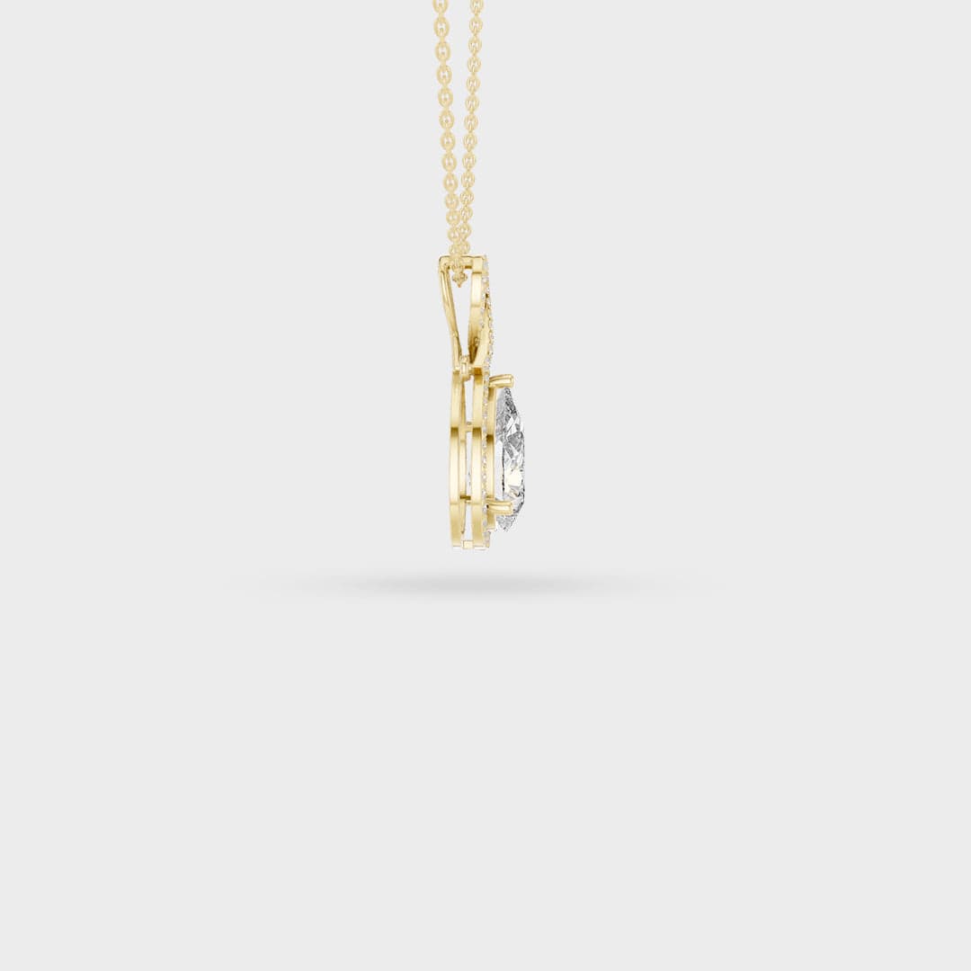 Description: Beautiful necklace features a central step-cut rectangular gemstone that shines with quiet clarity. This stone is framed by a halo of small, sparkling round gems, which catch the light and add brilliant fire.