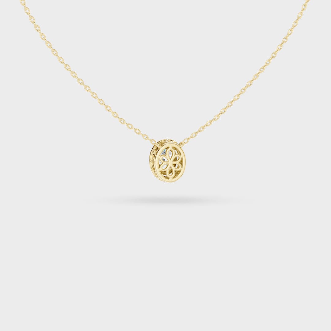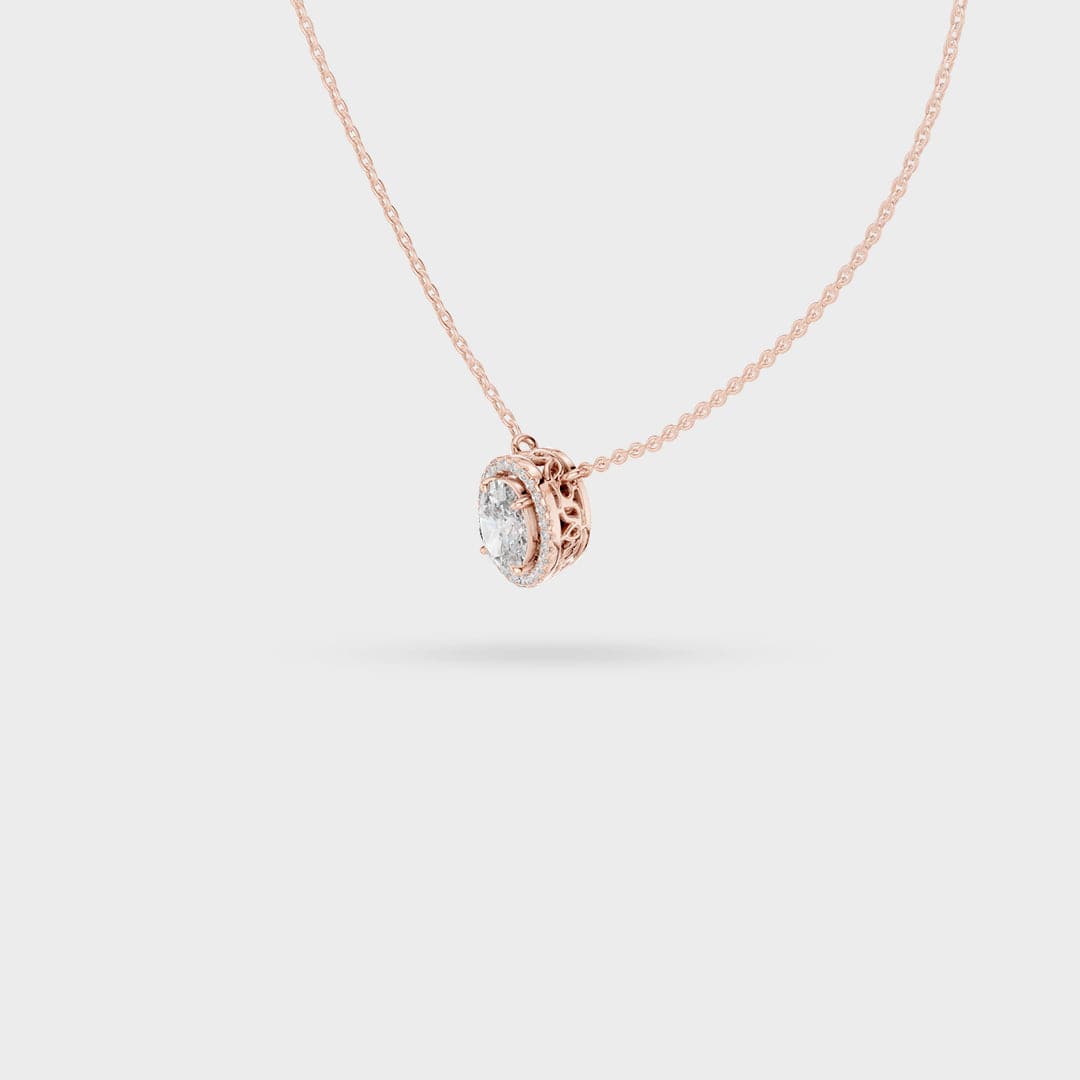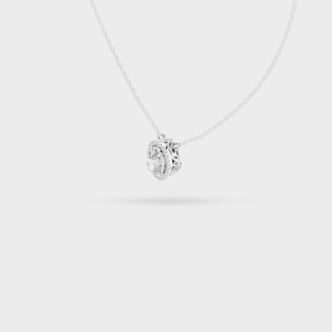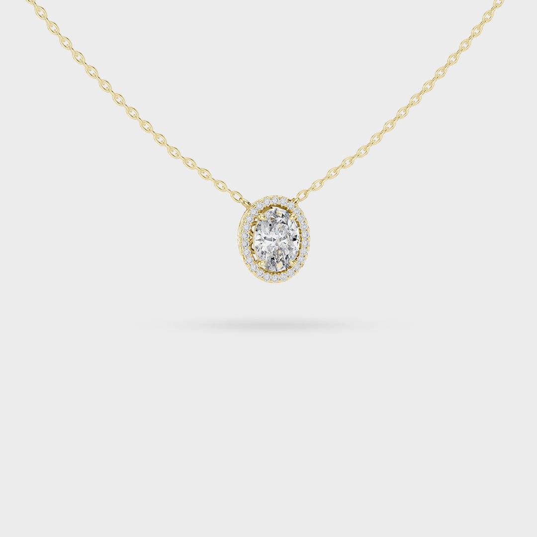 Description: This necklace showcases classic beauty with a sophisticated Oval Halo design. A brilliant oval-cut center gemstone is expertly framed by a border of smaller, sparkling accent gems. This halo not only enhances the brilliance but also makes the overall pendant appear significantly larger.