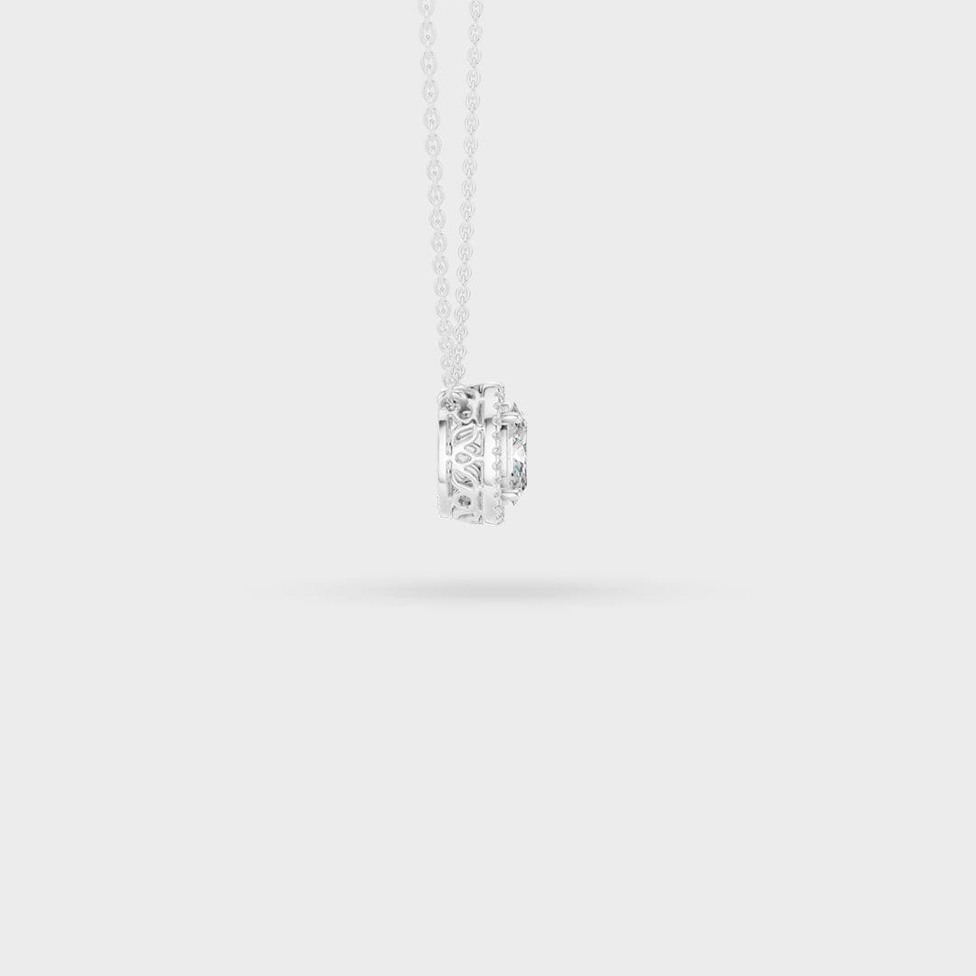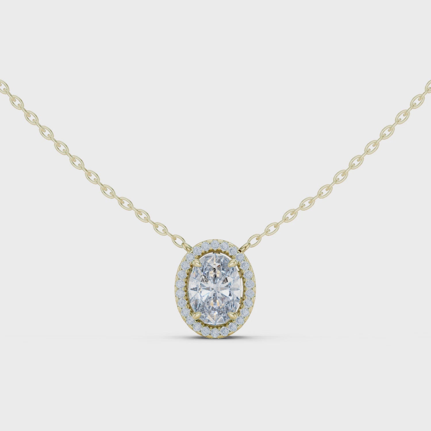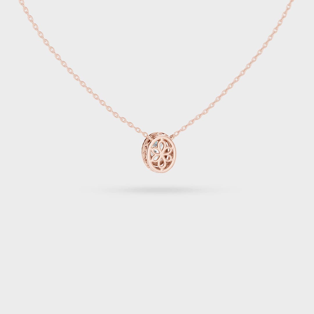 Description: This necklace showcases classic beauty with a sophisticated Oval Halo design. A brilliant oval-cut center gemstone is expertly framed by a border of smaller, sparkling accent gems. This halo not only enhances the brilliance but also makes the overall pendant appear significantly larger.