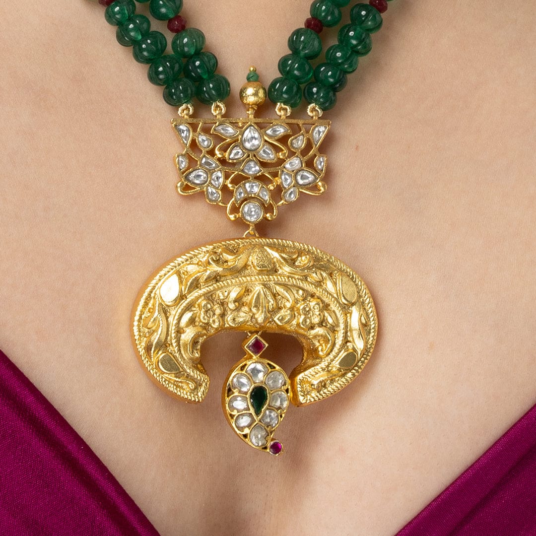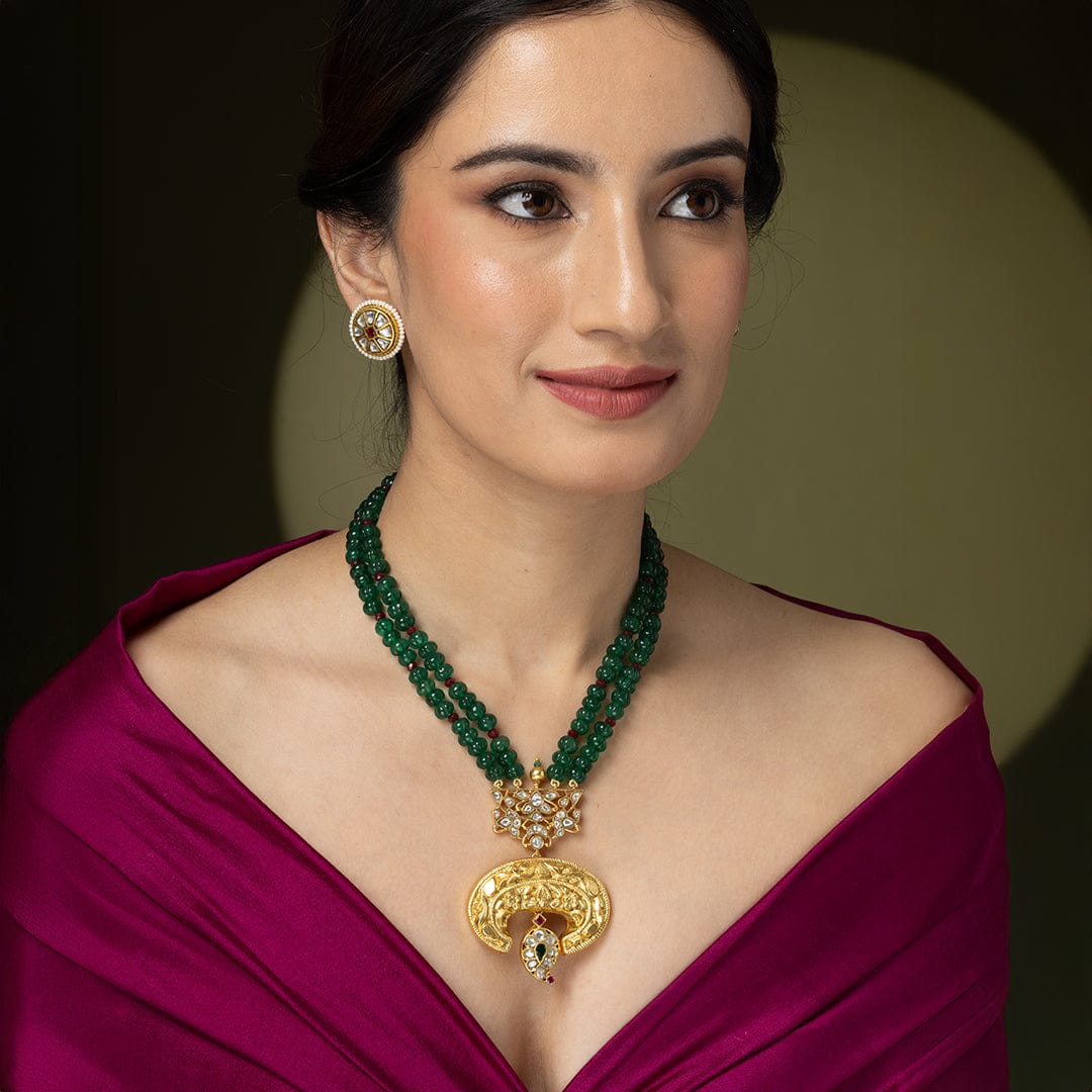 Description: A whisper of history against your skin. This long necklace piece captures the jungle's heart: green beads and a grand, sun-warmed peacock long necklace that feels weighty with centuries of stories untold.