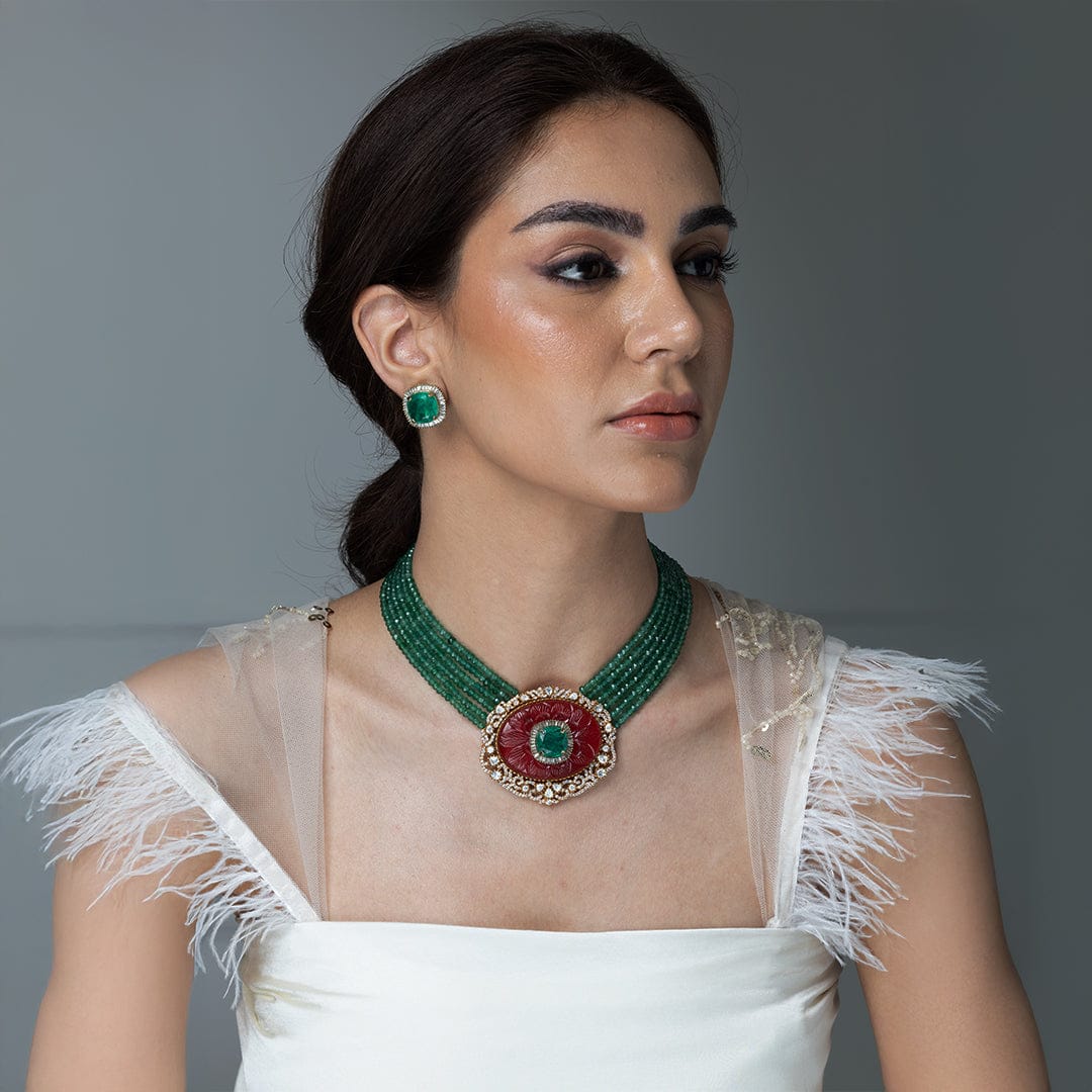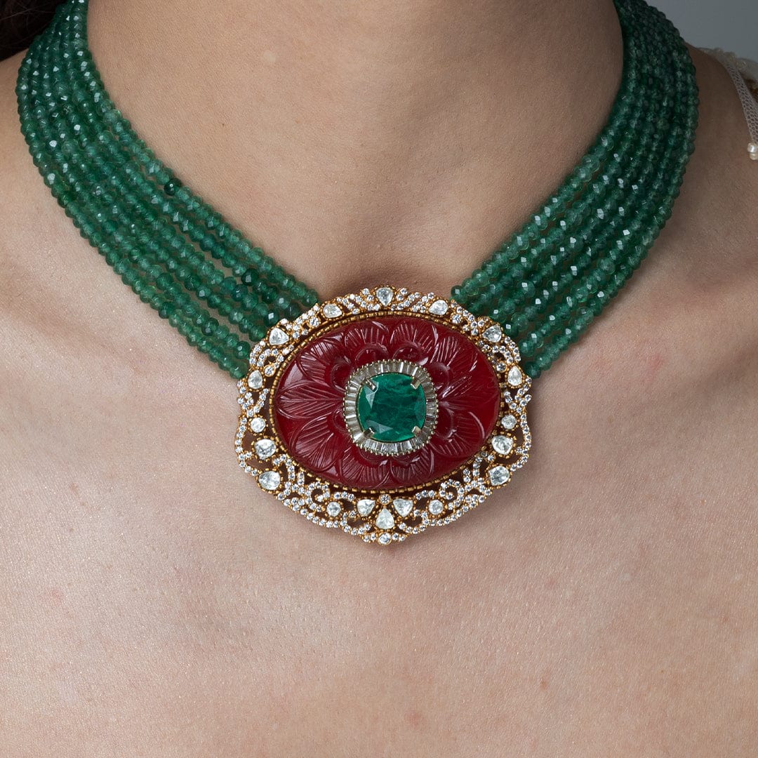 Description: This bold ShopJBR necklace features vibrant green onyx bead strands leading to a statement pendant. The centerpiece showcases a carved ruby-hued oval and a central emerald-style stone, beautifully bordered by sparkling settings.
