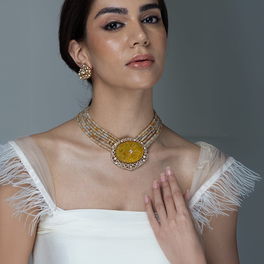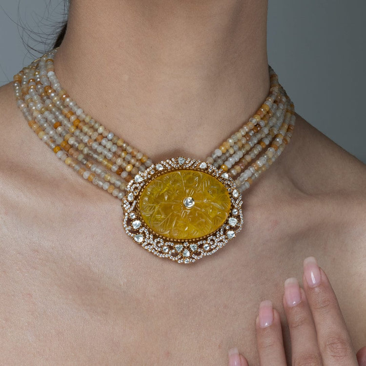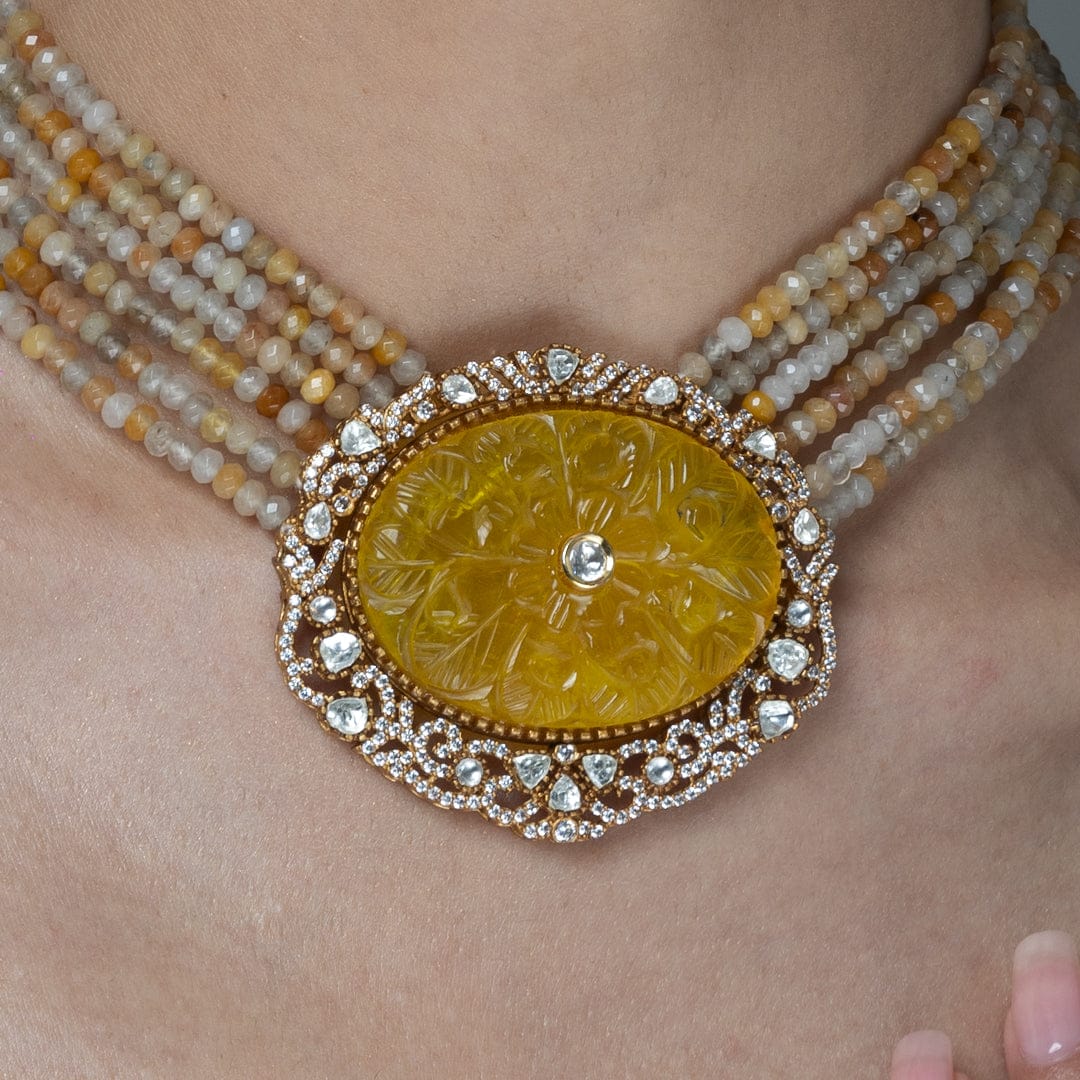 Description: Experience regal elegance with this unique ShopJBR long necklace . It features multiple strands of seed beads leading to a stunning oval centerpiece with intricate yellow carving, bordered by sparkling stones. A vibrant statement piece!