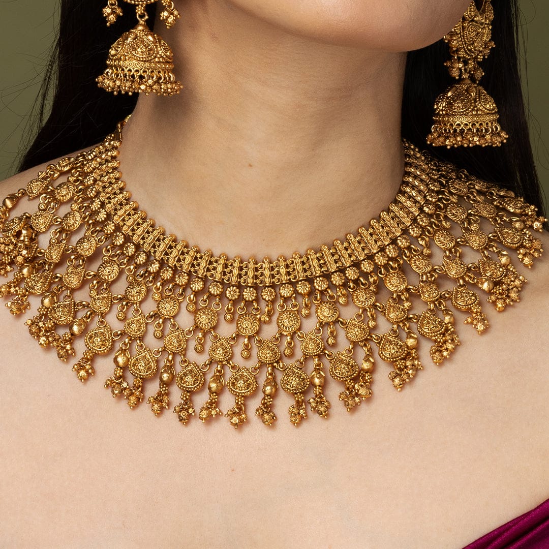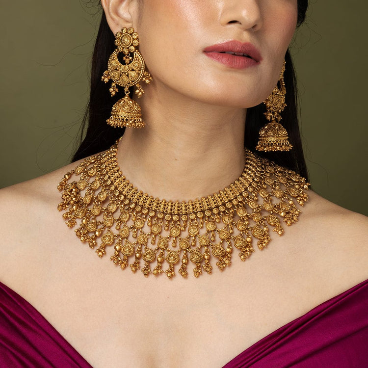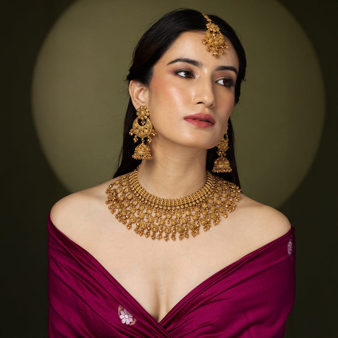 Description: Immerse yourself in royal splendour with this magnificent Necklace set. The wide, sculpted band features intricate detailing with majestic figures and a central accent piece.