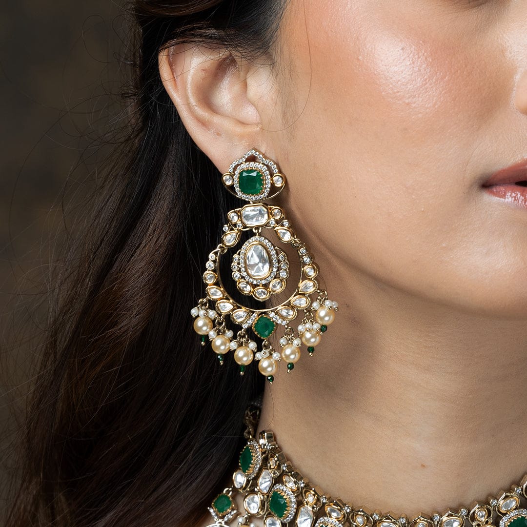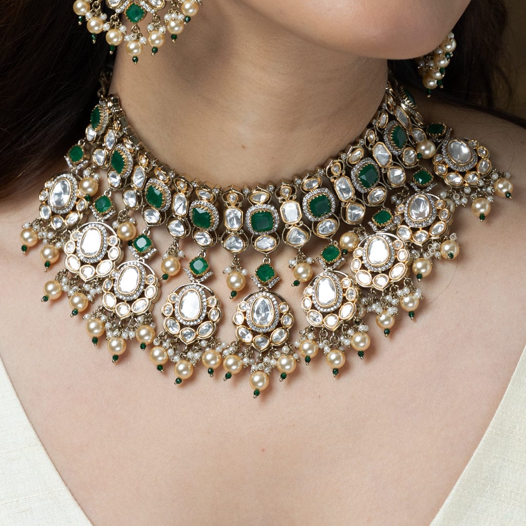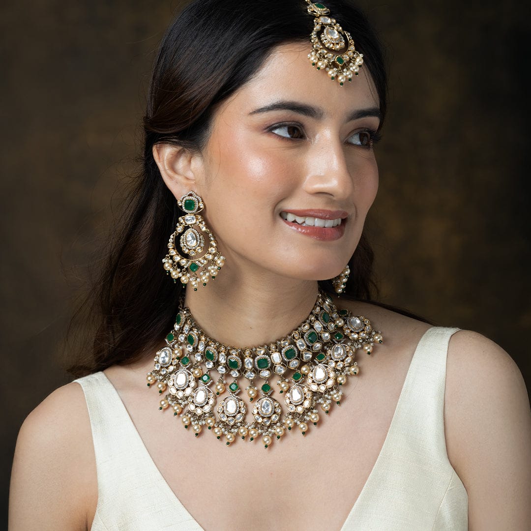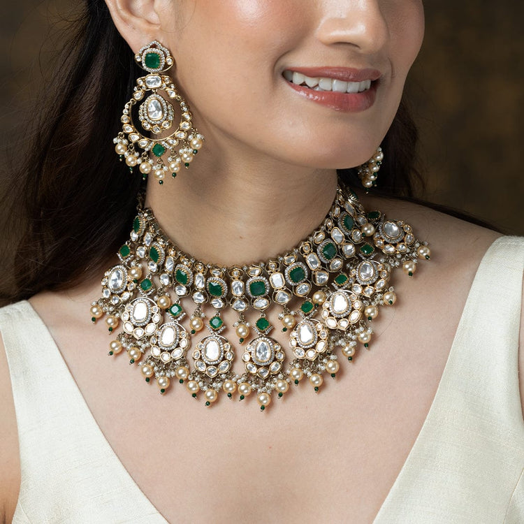 Description: Illuminate your special day with this exquisite necklace set. Featuring dazzling uncut Polki stones and tiny seed pearls, complemented by rich emerald drops. The perfect heirloom-quality bridal or festive statement.