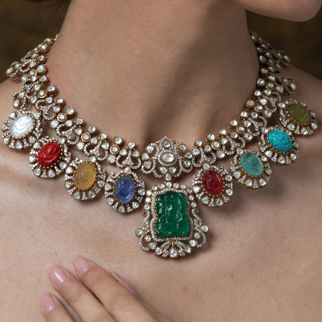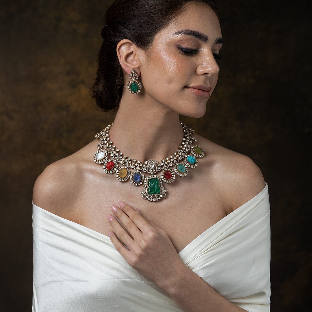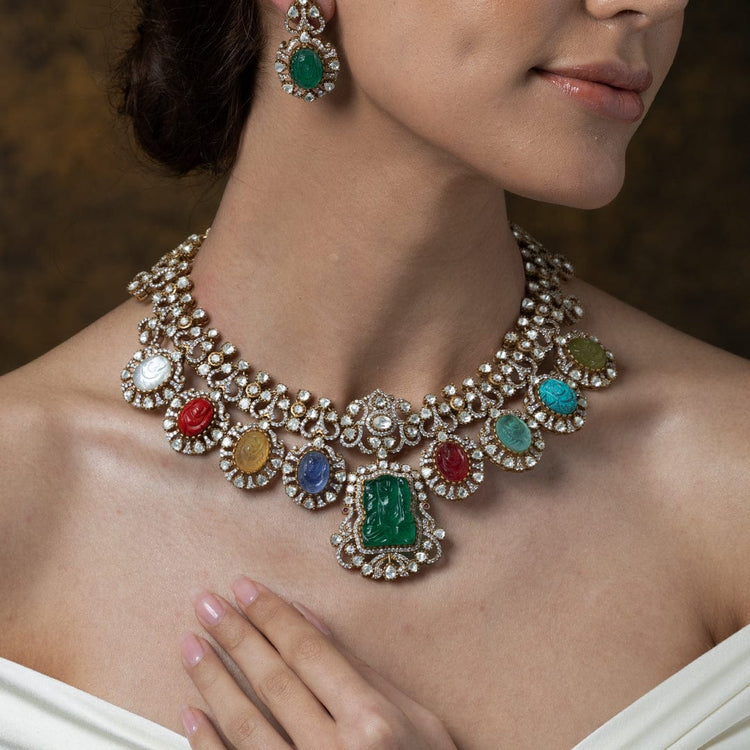 Description: This grand necklace set features a central carved green stone pendant framed by luminous multi-colored circular stones and clear accents. Its rich detailing makes it a magnificent and striking gift..