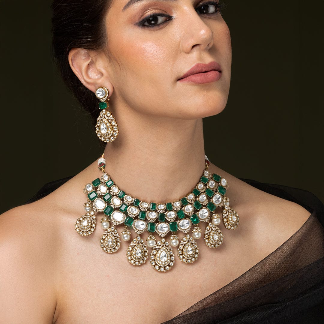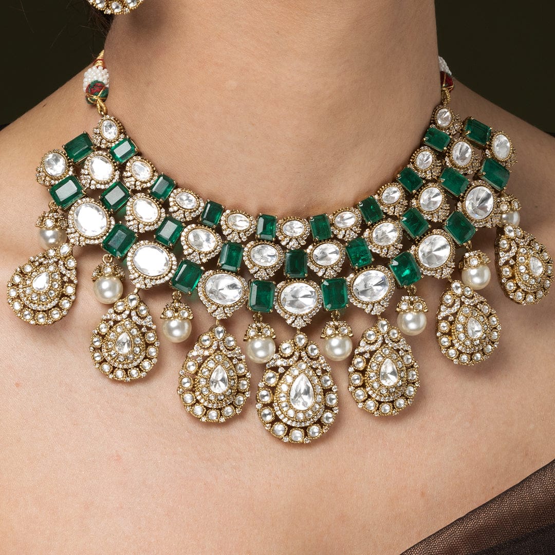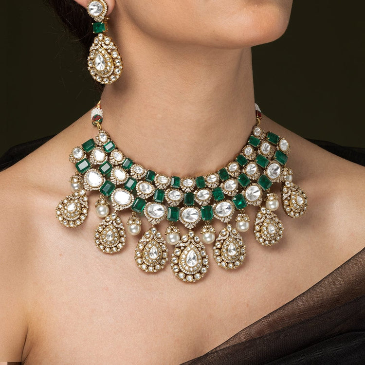 Description: When the light catches, a story unfolds. This magnificent choker necklace set with undeniable brilliance settles, heavy with significance. It's the silent confidence that elevates a beautiful moment into a cherished memory.