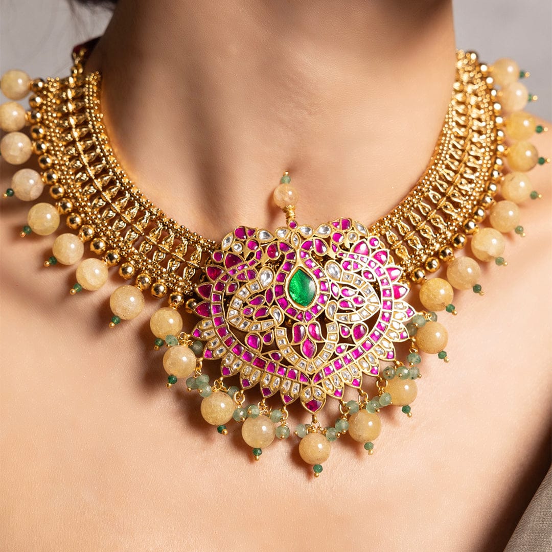 Regular price Rs. 24,500.00Description: A striking heritage-inspired necklace set in antique gold with a radiant lotus-shaped pendant at its heart. Traditional yet bold, its ideal for brides seeking timeless grandeur with a touch of color.