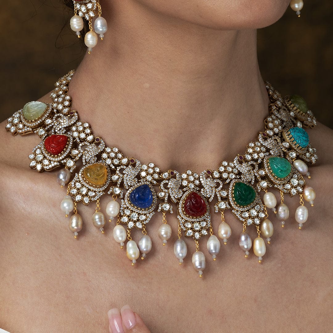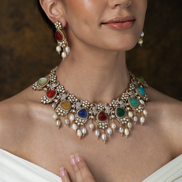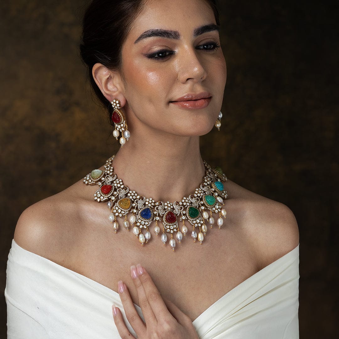 Description: A vibrant Necklace set showcasing ornate floral motifs set with brightly colored stones—red, yellow, blue, and green—accented with small hanging pearl drops. This festive piece is excellent for a memorable gift.