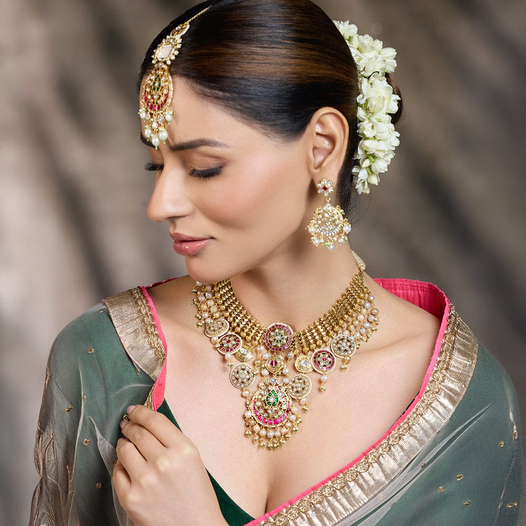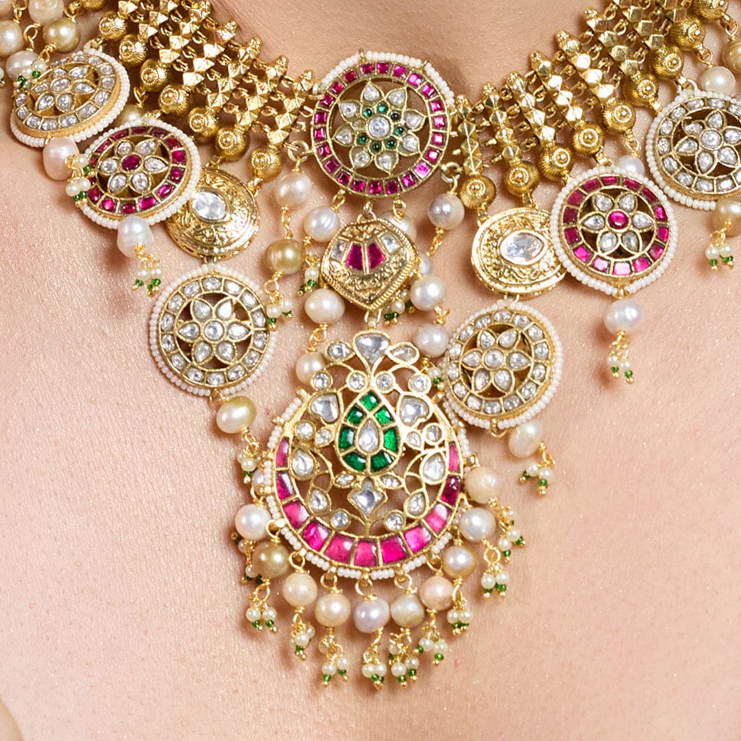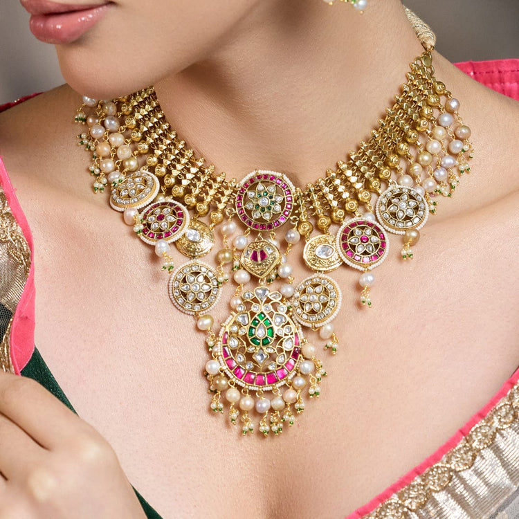 We use 22K Micron Gold Plating on brass, paired with high quality pearls, precious carved beads, semi precious stones, intricately hand painted with enamel, exquisite high quality pearls and high quality kundan that are celebrated for their durability and refinement - making every Joules by Radhika creation a piece that radiates brilliance and sophistication.