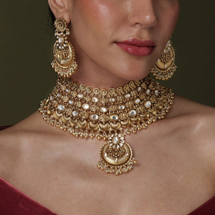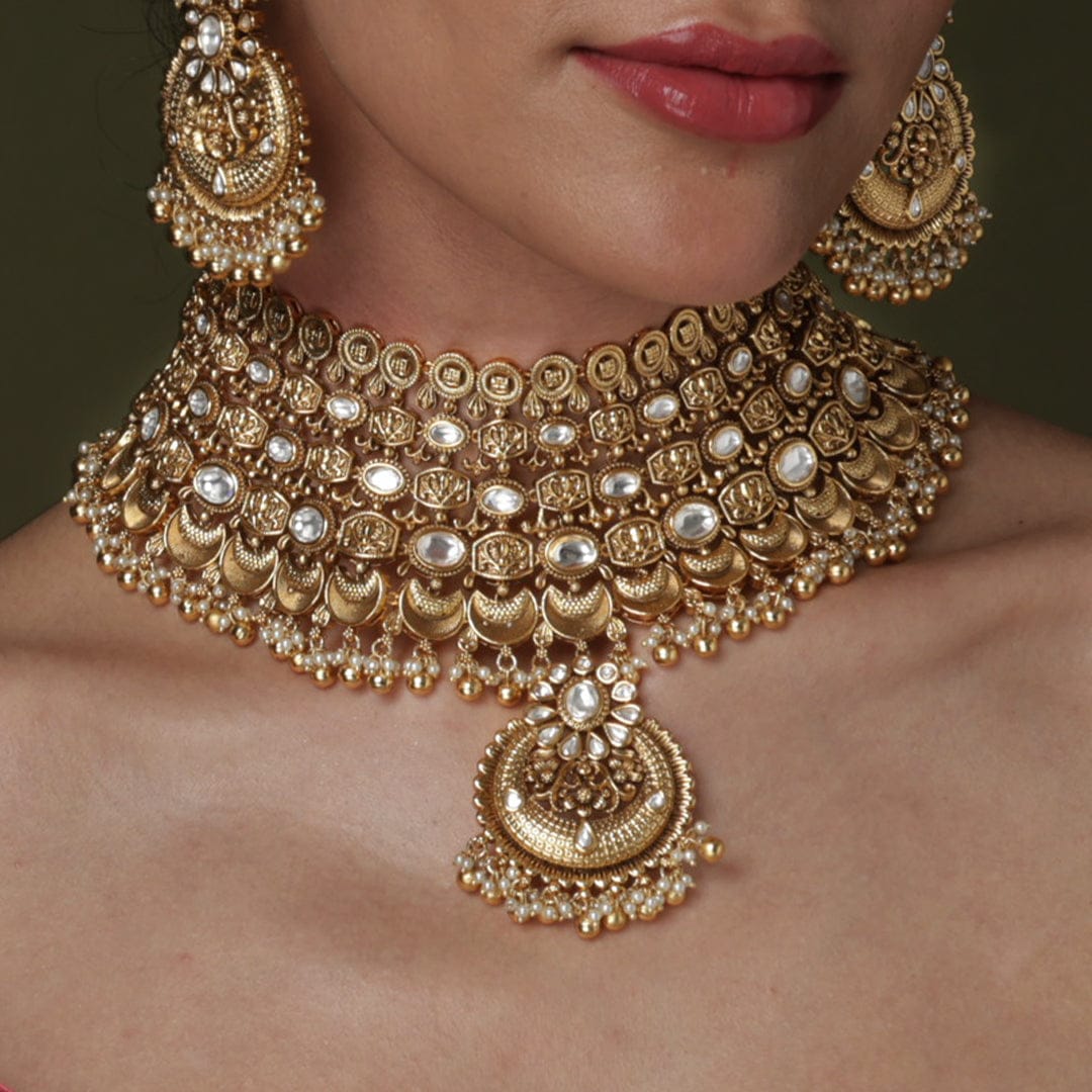 Description: This truly magnificent Necklace set includes beautiful matching earrings and a maang tikka. The elaborate design features intricate metalwork and sparkling flat-cut gems, with a prominent central sunburst pendant..