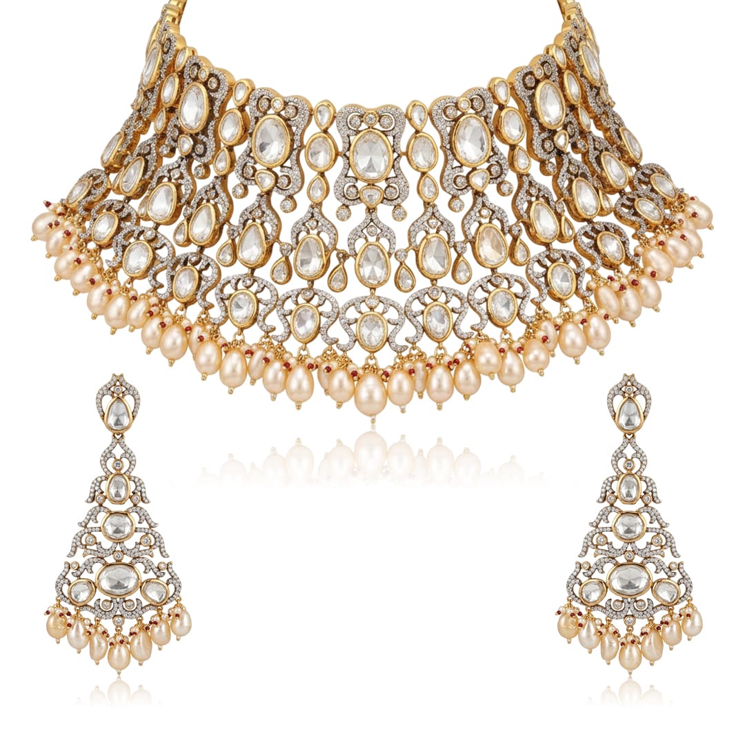 Regular price Rs 36,750We use all premium materials to handcraft every product exclusively for you. All products are 22 KT gold or rose gold plated or rhodium plated, made with high quality pearls, precious carved beads, semi precious stones, intricately hand painted with enamel, exquisite high quality pearls and high quality kundan.