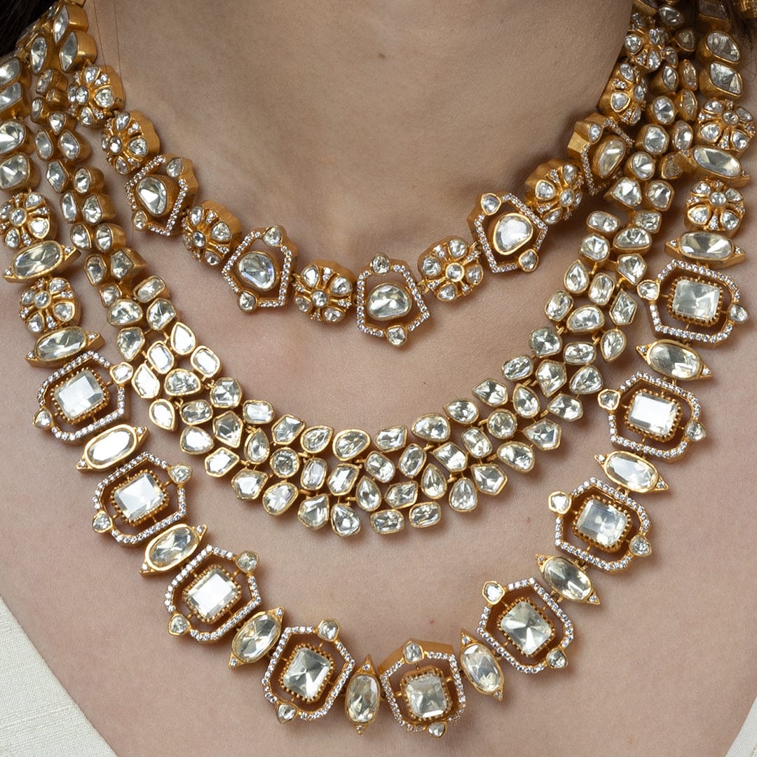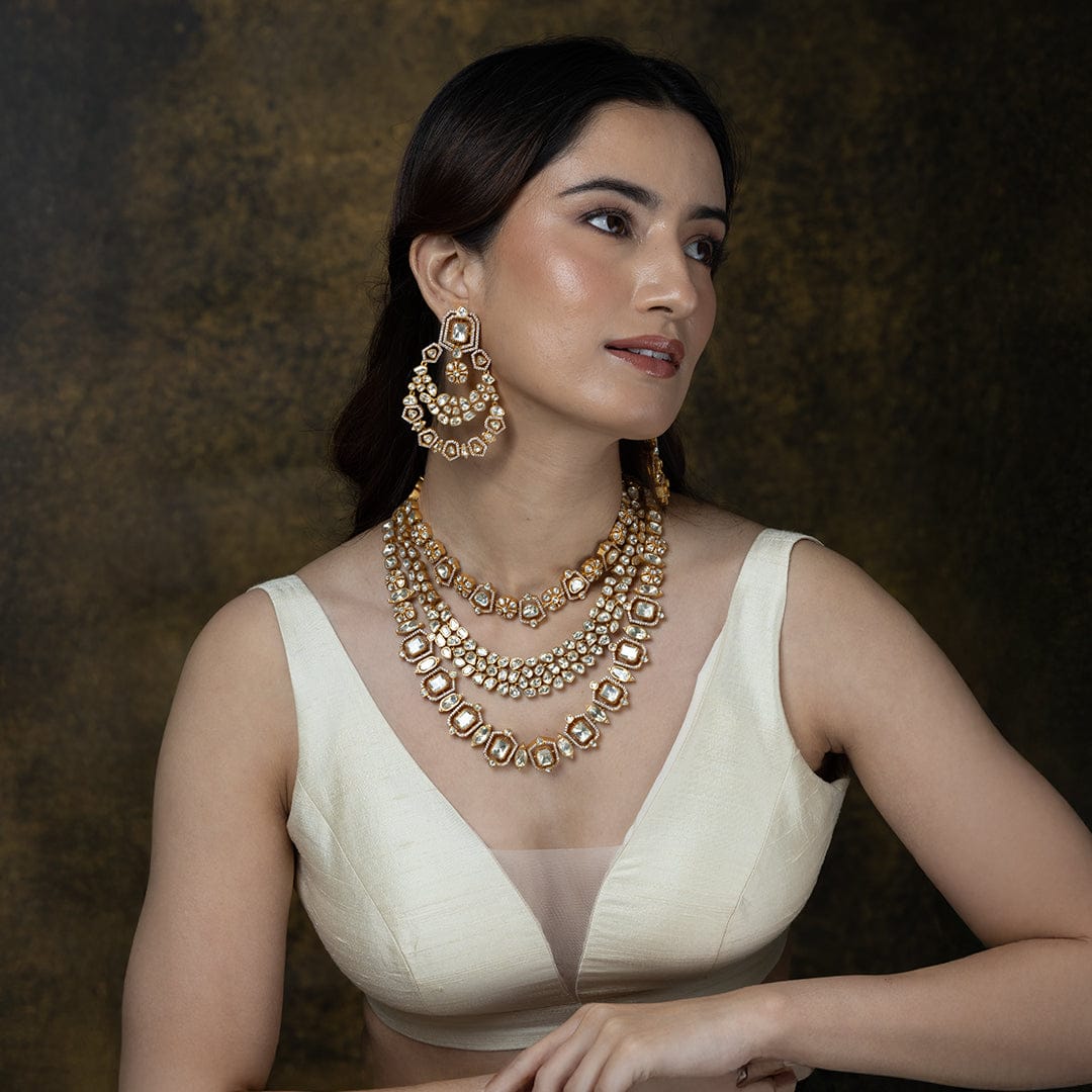 Regular price Rs. 56,250.00Description: This beautifully layered, exclusive stone necklace set is crafted to give a classic and regal look. With multiple cascading tiers and matching earrings, it adds depth, shine, and elegance to any traditional outfit.