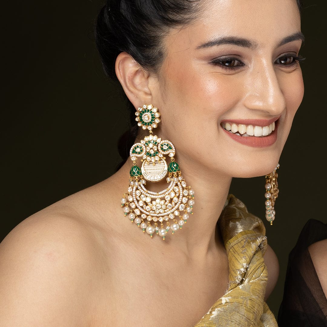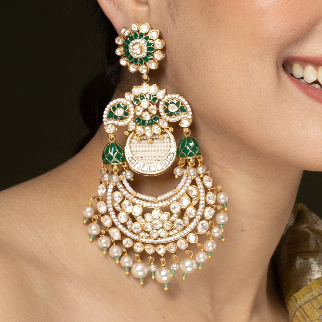 Description: Grand chaandbaali earrings showcasing intricate green and clear stone work with layered pearl drops cascading from the crescent base. Their timeless elegance makes them a truly luxurious gift.
