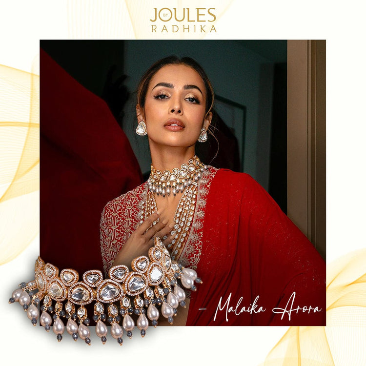 We use 22K Micron Gold Plating on brass, paired with high quality pearls, precious carved beads, semi precious stones, intricately hand painted with enamel, exquisite high quality pearls and high quality kundan that are celebrated for their durability and refinement - making every Joules by Radhika creation a piece that radiates brilliance and sophistication.