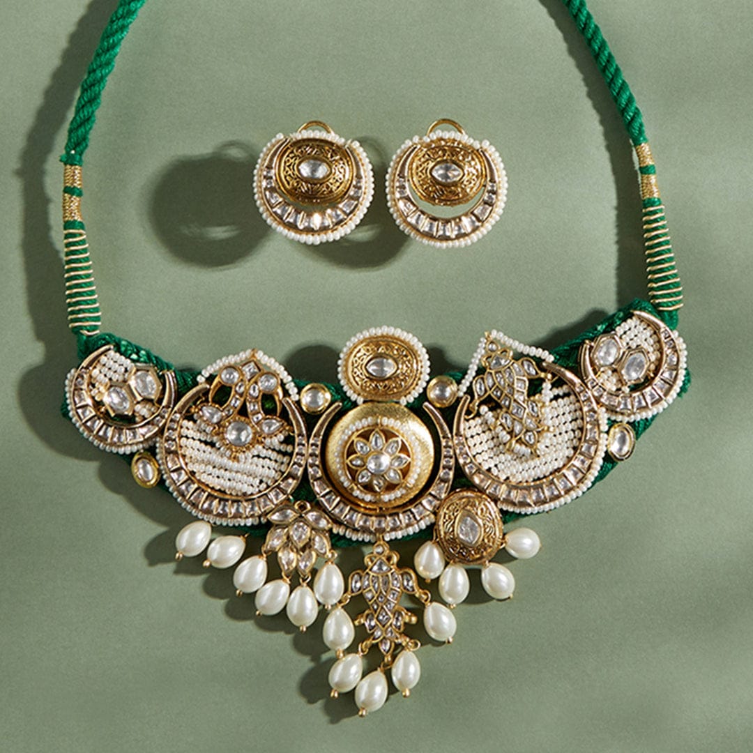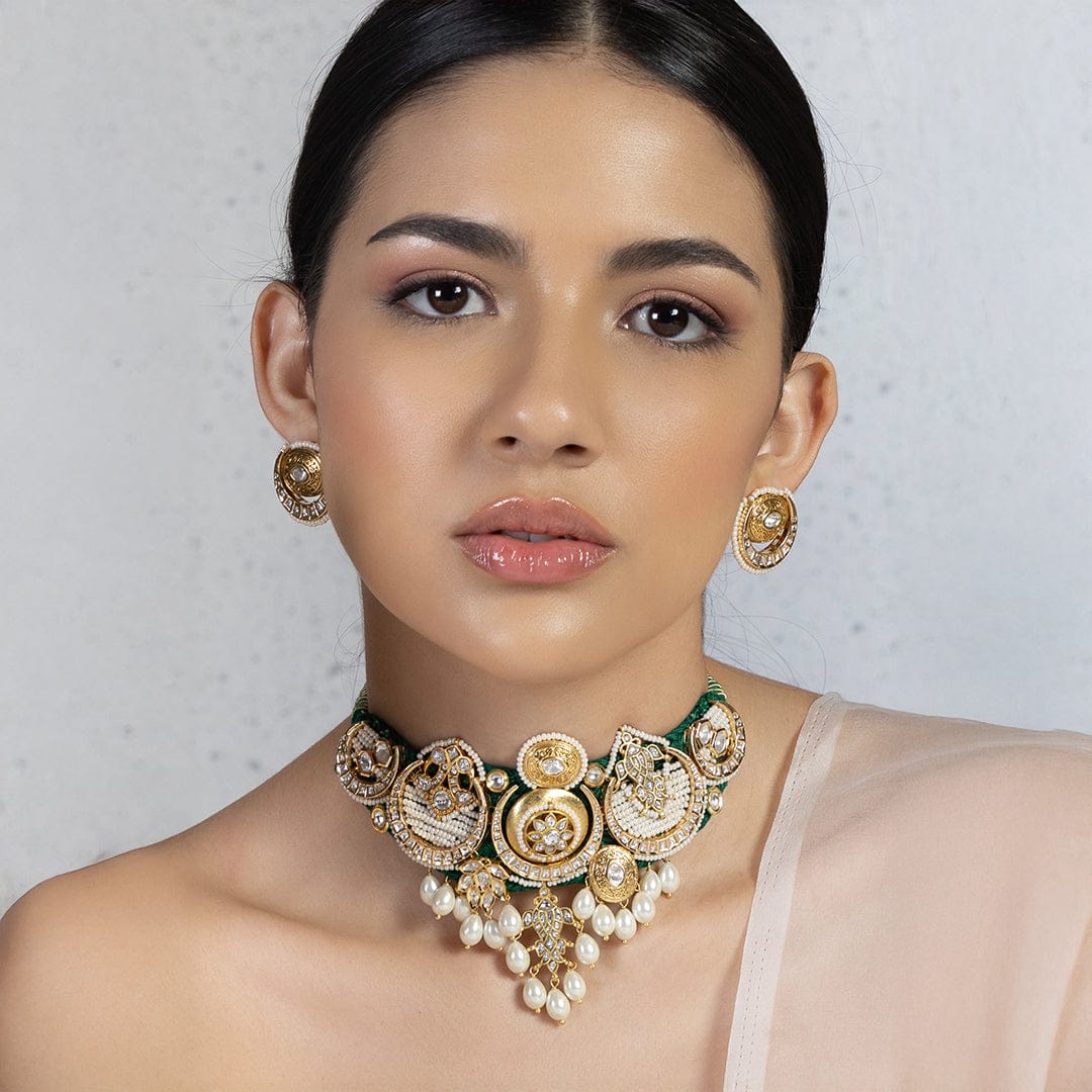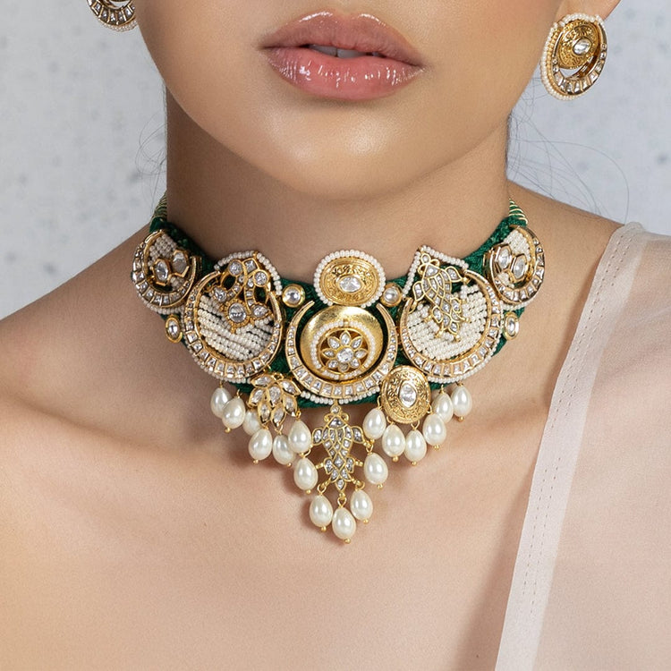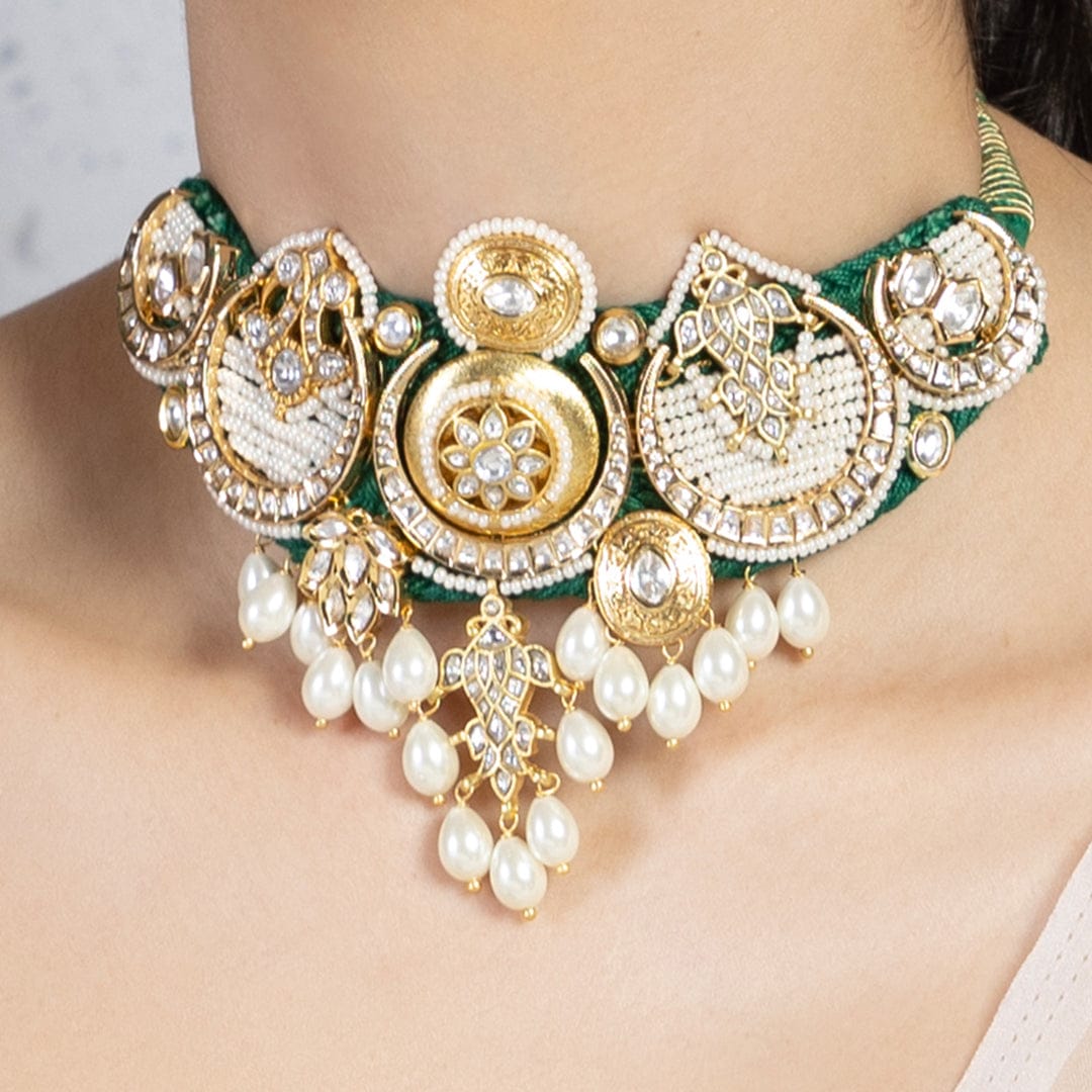 Description: Experience elegance and sophistication with the Transcendent Polki And Pearl Choker. 22Kt Gold Plated, adorned with enchanting hydro polkis, lustrous shell pearls, and a stunning brass carved pendant. Designed to shine at weddings, parties, or personal milestones, this masterpiece allows you to make a statement, showcasing your beauty and poise. Matching earrings available on request.