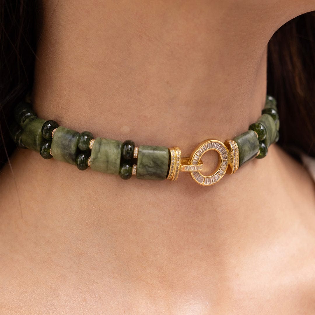 Description: Deep jade green beads come together in this choker, accented with an antique-style center link. Its bold yet minimal silhouette makes it a great pick for experimental sarees and modern ethnicwear.