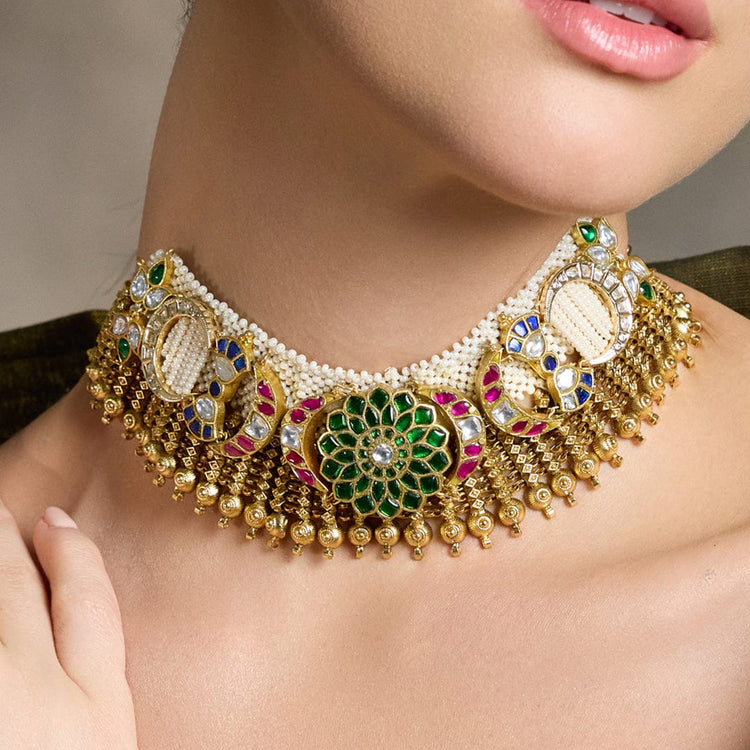 Description: Embrace elegance with this golden beaded necklace and earring set, adorned with vibrant green, red, and white beads in intricate patterns. A celebration of craftsmanship and tradition, it radiates festive brilliance and adds regal charm to every ensemble. Add matching earrings & accessories to complete the look.