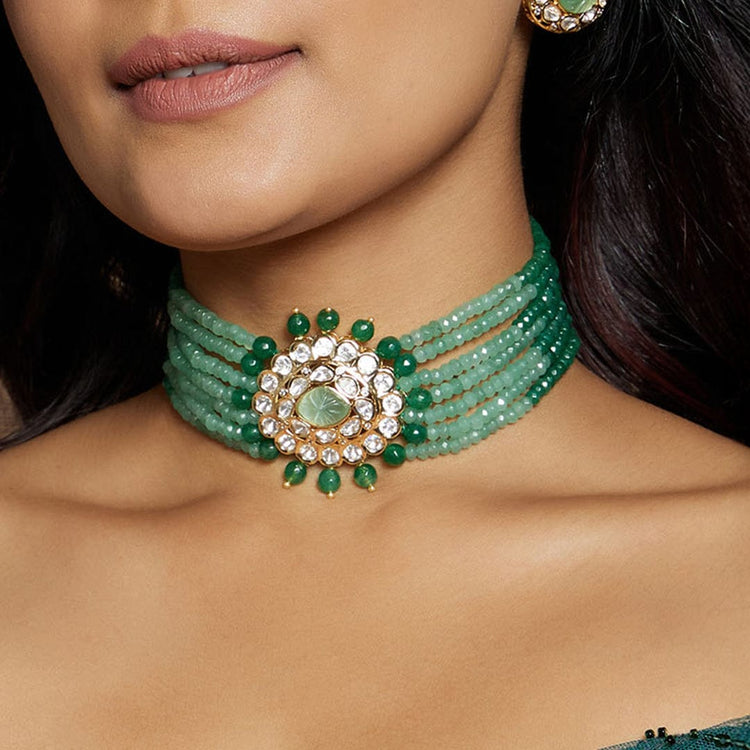 Regular price Rs. 8,175.00Description :Refine yourself with the Multi Shaded Green Polki Choker Set, a handcrafted masterpiece featuring kundan polki beads, green agates, and a carved monalisa stone center. Perfect for festive, wedding, and party occasions with Indian & fusion attire. Each piece from Joules by Radhika is crafted with real semi-precious stones, exuding regal elegance. The adjustable locking system ensures a perfect fit for all neck sizes.