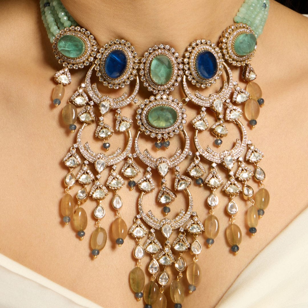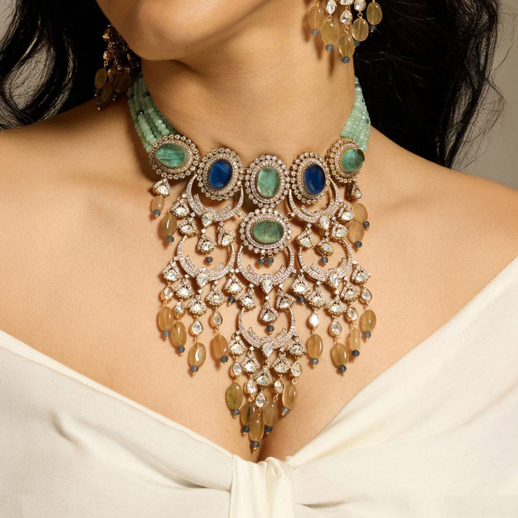Description: Oceanic Emerald Necklace Set blends the deep hues of green and blue stones in a breathtaking combination, complemented by intricate craftsmanship. This necklace and earring ensemble is perfect for those seeking a bold yet refined look for festive events or bridal occasions. The harmonious mix of colors evokes a sense of regal beauty, making it a standout piece that adds vibrant sophistication to any ensemble.
