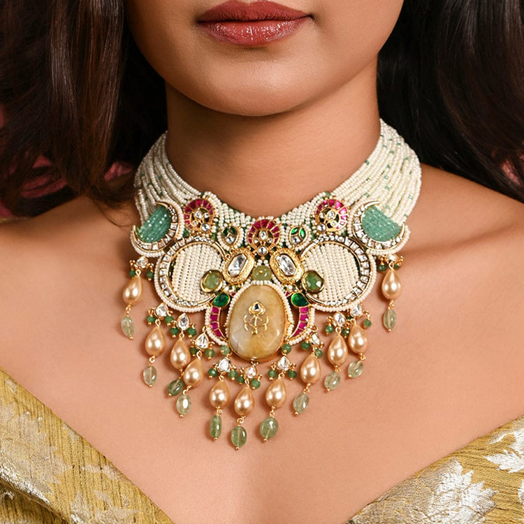 We use 22K Micron Gold Plating on brass, paired with high quality pearls, precious carved beads, semi precious stones, intricately hand painted with enamel, exquisite high quality pearls and high quality kundan that are celebrated for their durability and refinement - making every Joules by Radhika creation a piece that radiates brilliance and sophistication.