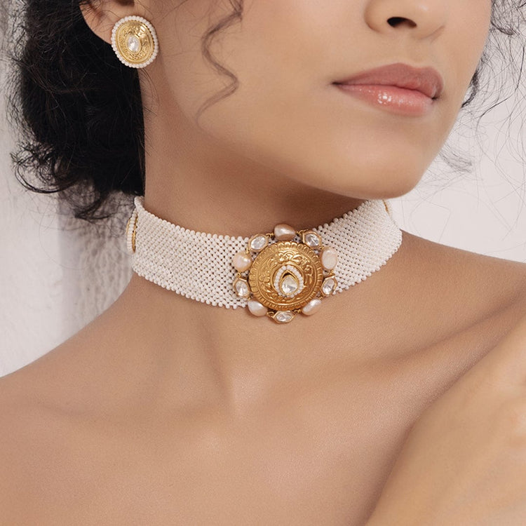 Description: An elegant choker necklace set crafted from brass with a yellow gold and white plating.