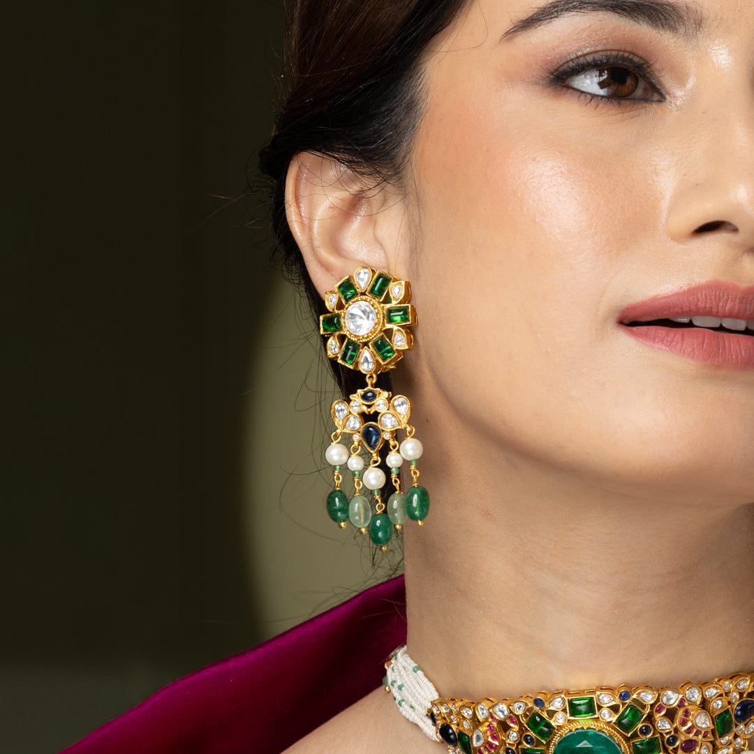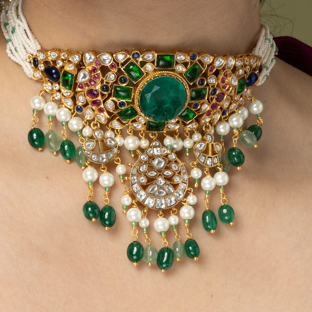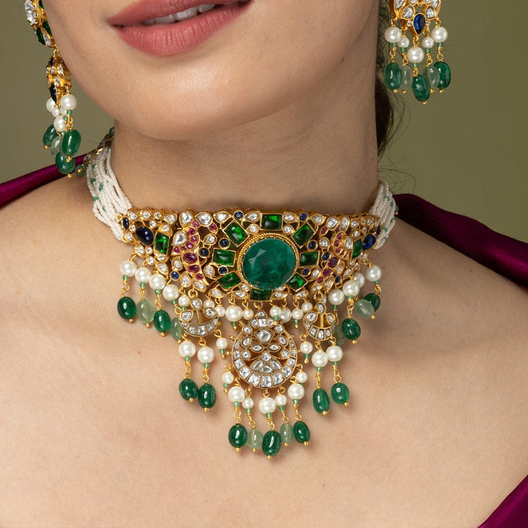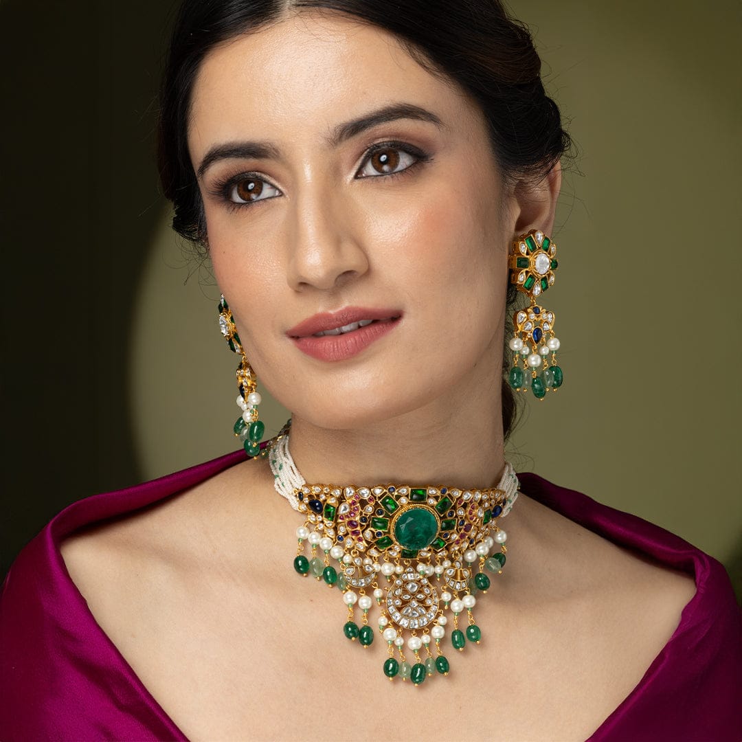 Description: Adorn yourself in royal splendor. This exquisite choker necklace set features a vibrant mosaic of hand-painted Meenakari, lustrous Kundan gems, and cascading emerald droplets. A true celebration of heritage artistry.