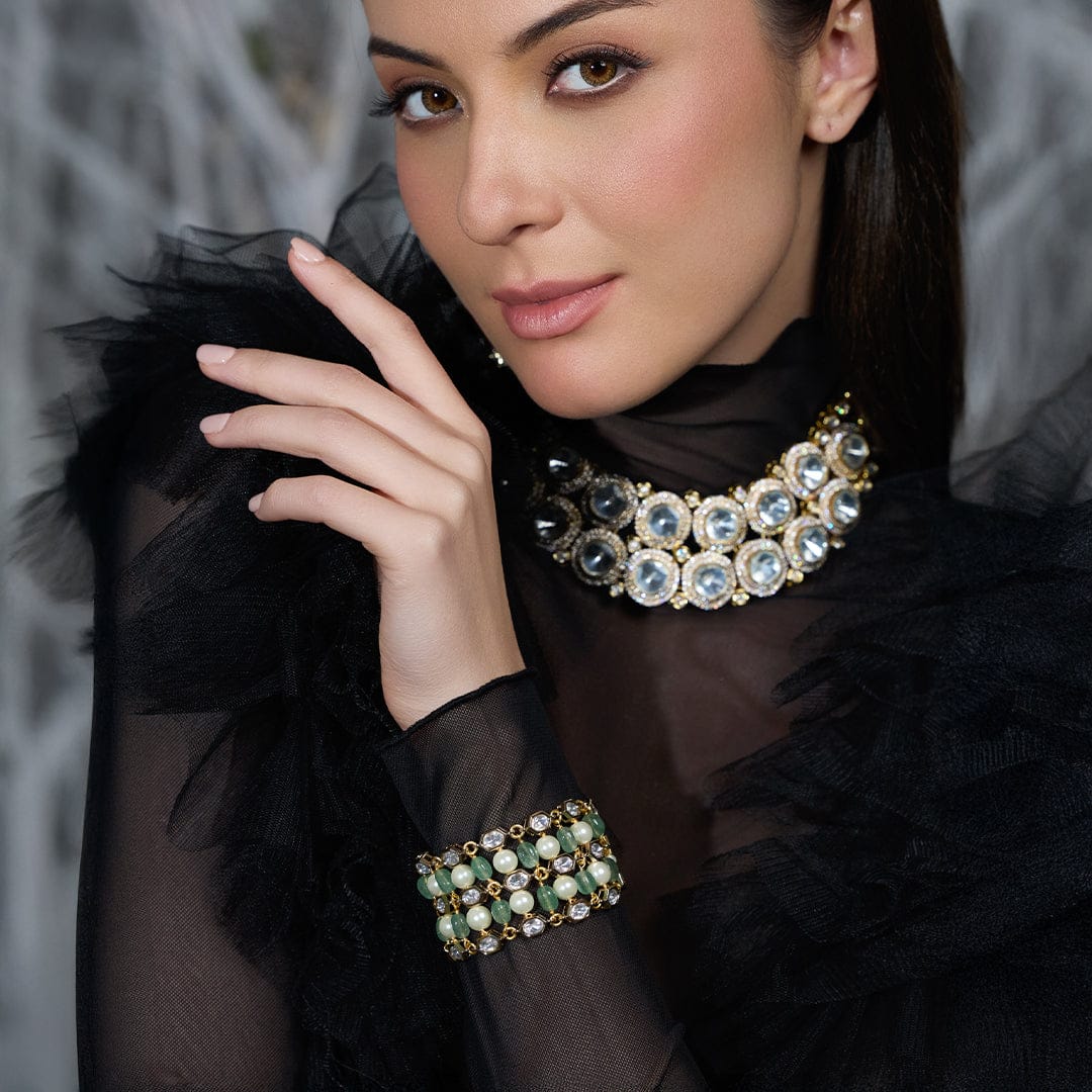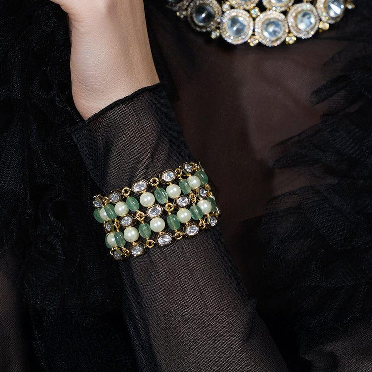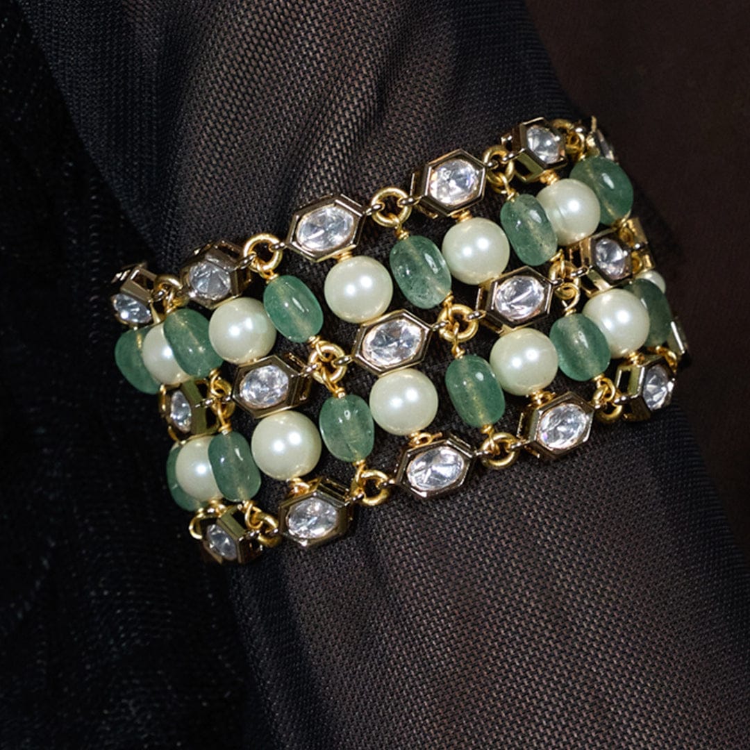 Description : A graceful fusion of pastel green, white, and gold-pleted beads, this handcrafted cuff bracelet offers a balanced, elegant look — ideal for ethnic wear or classy everyday styling.