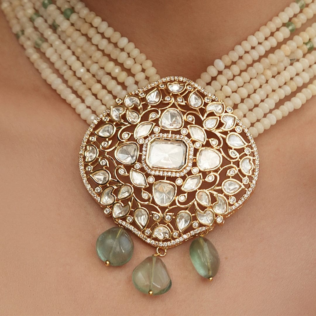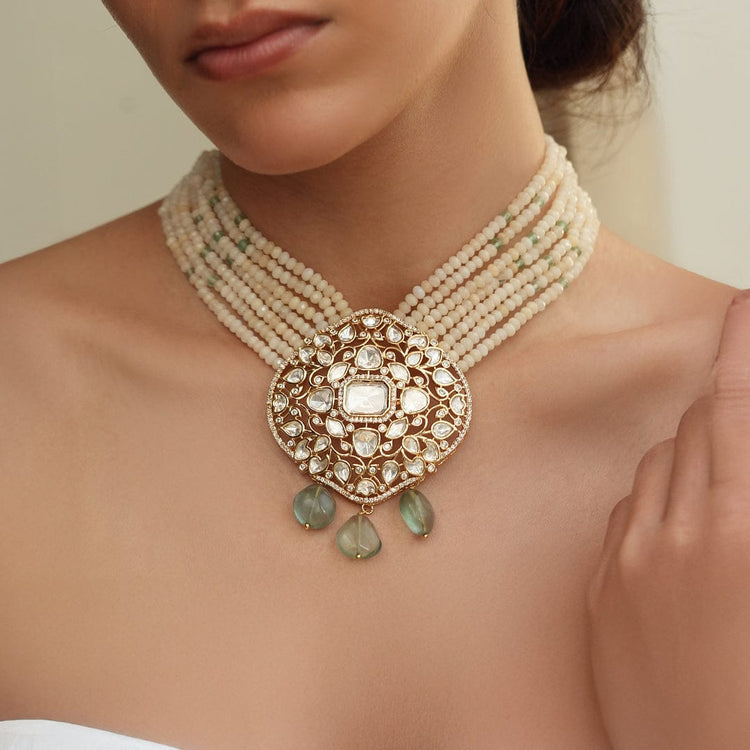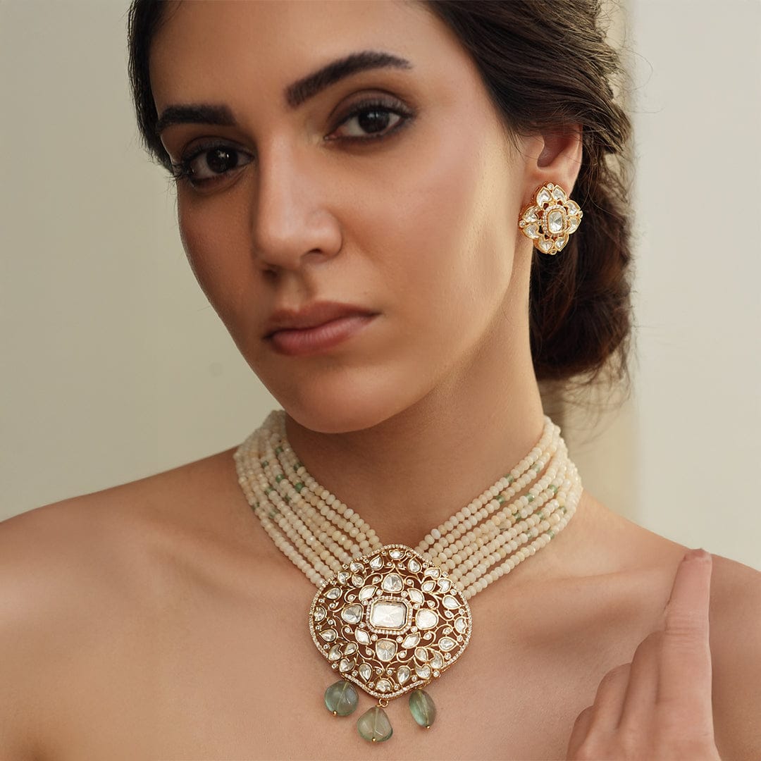 Description: A sophisticated broad-layered necklace set crafted with cream beads, featuring a dazzling Polki center piece. The design brings together traditional elegance and modern charm, perfect for any formal or festive occasion.
