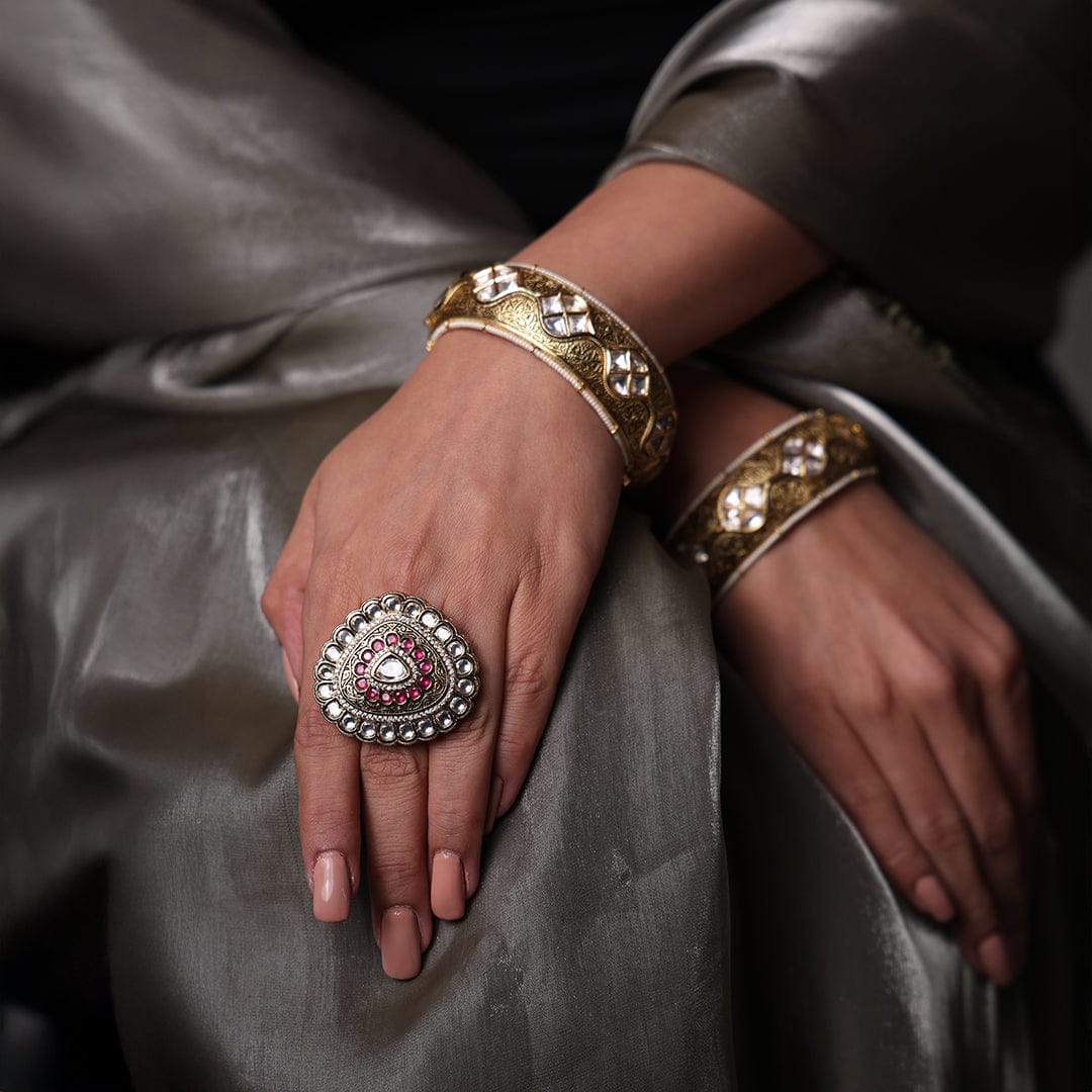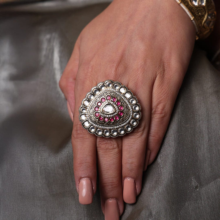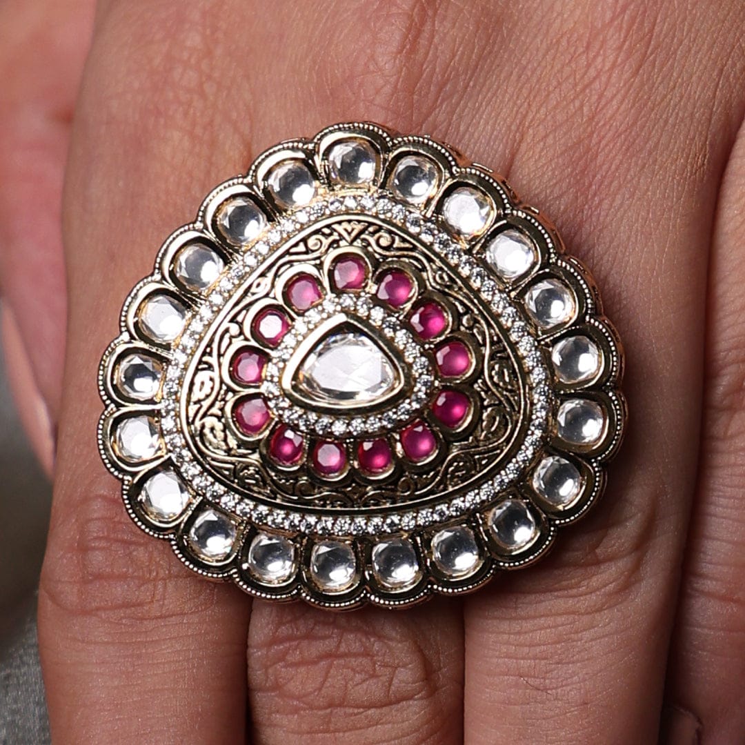 Description : The Vibrant red ruby gold-plated ring is a true statement piece that has a delicate design and stunning white kundan stones that give an exclusive look. Perfectly goes with traditional wear during festive occasions, weddings, and special events.