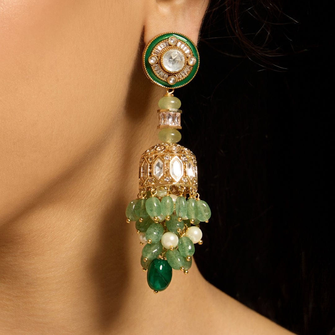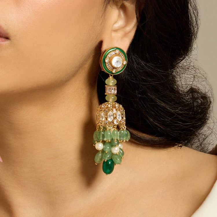 Description: Mystic Green Drop earrings showcase a striking green stone in a sleek, straight drop design, paired with a captivating and intricate structure. Bold and contemporary, these earrings add a touch of sophistication and flair to any ensemble, perfect for festive or formal occasions. Their unique design highlights the beauty of simplicity, making them a true statement piece for those who appreciate artistic craftsmanship.