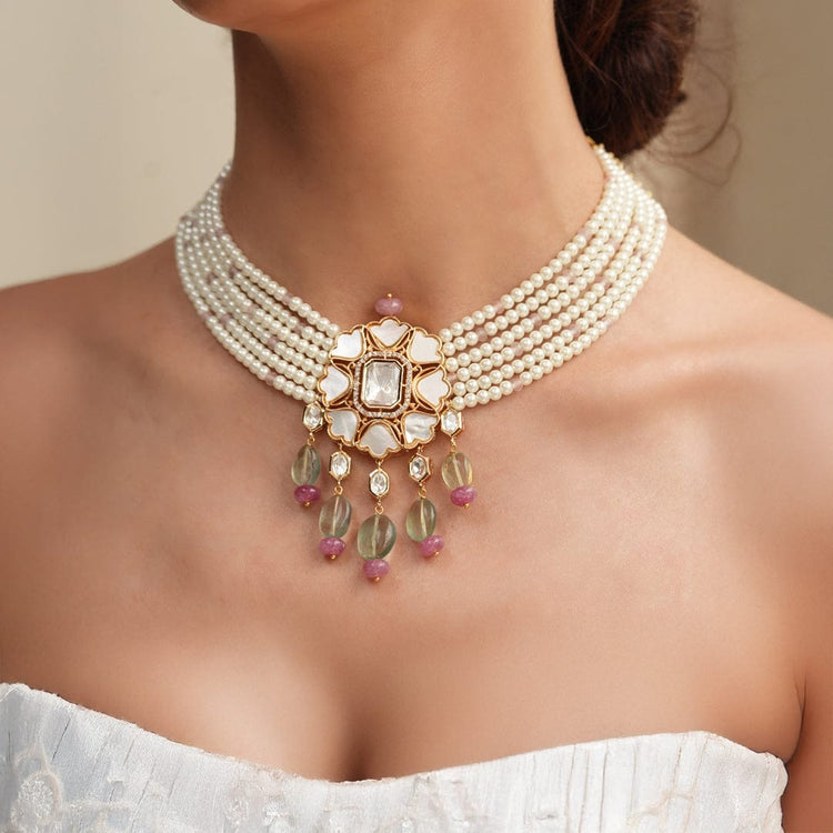 Description: A graceful fusion of white beads, this set features a stunning polki center pendant with green and pink hanging accents, offering a soft yet striking vibe.
