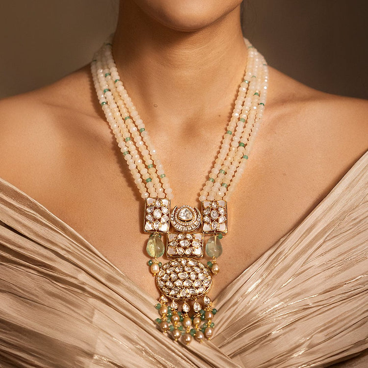 We use 22K Micron Gold Plating on brass, paired with high quality pearls, precious carved beads, semi precious stones, intricately hand painted with enamel, exquisite high quality pearls and high quality kundan that are celebrated for their durability and refinement - making every Joules by Radhika creation a piece that radiates brilliance and sophistication.