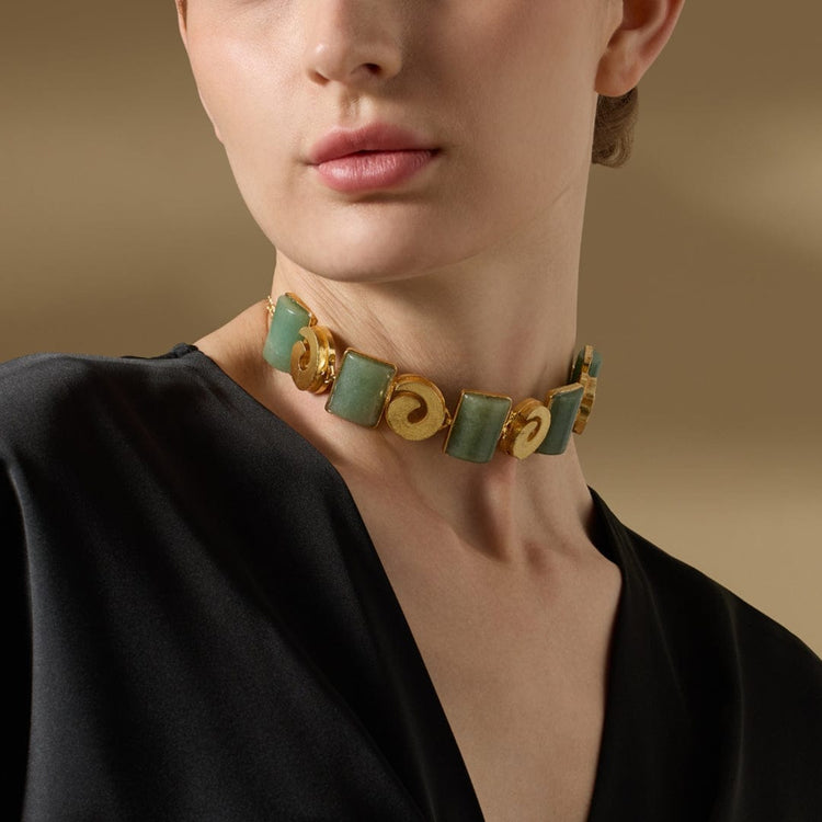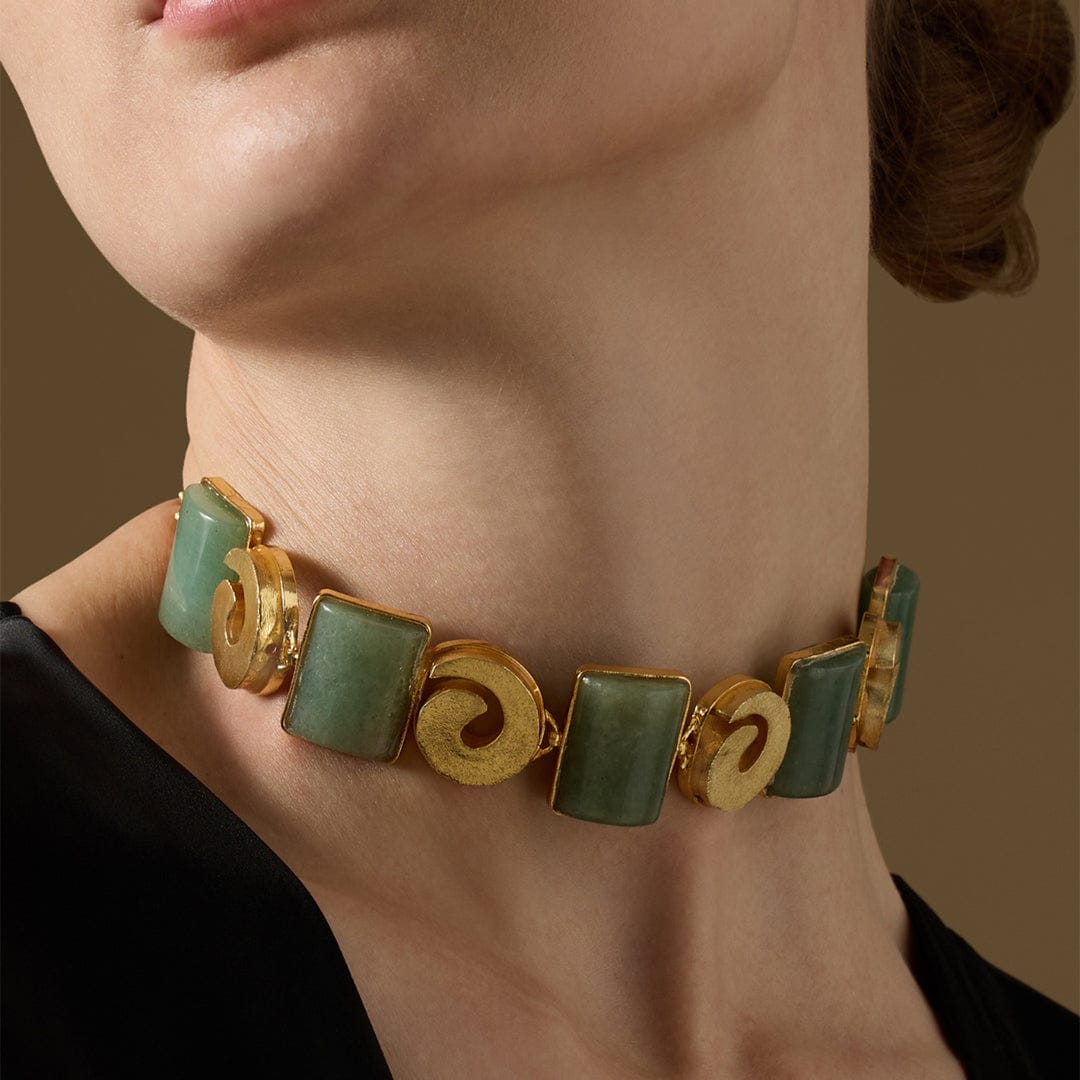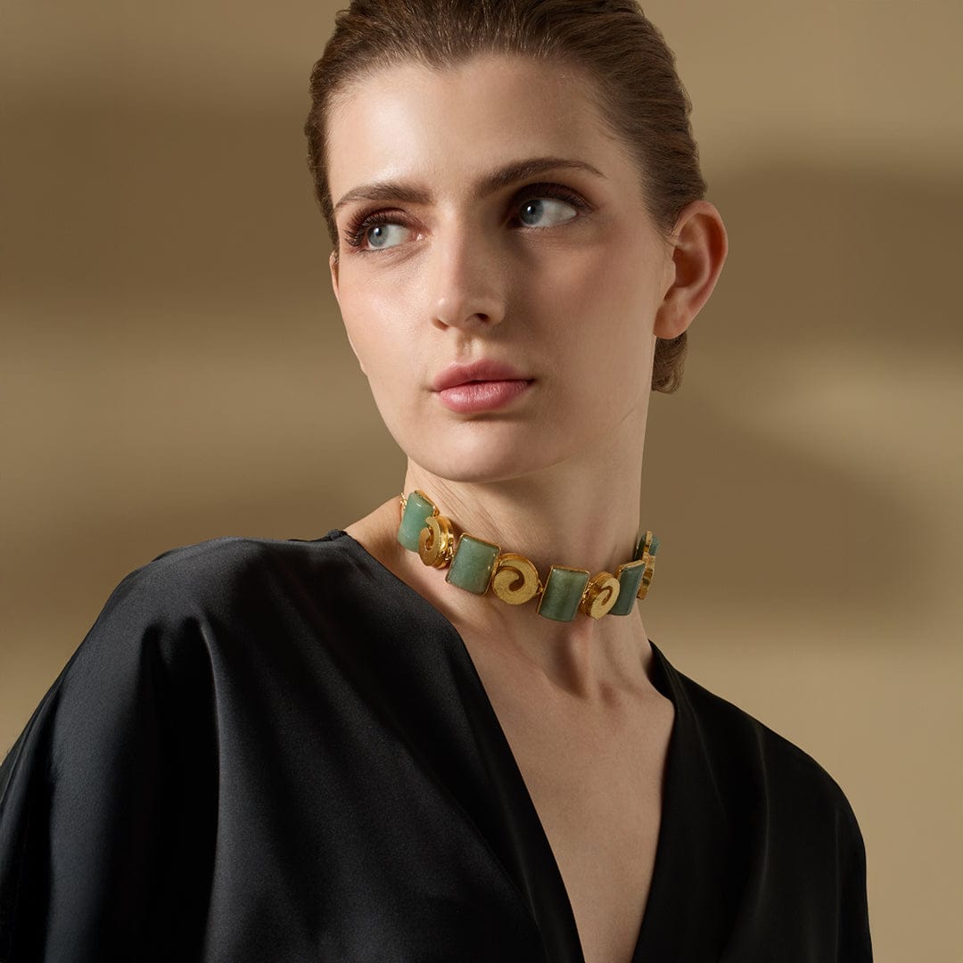 Description: Inspired by lush forest canopies, the Liora Choker features smooth, polished green Agate stones set along a structured band. Rich in earth tones and grounded elegance, this piece brings the calming essence of nature into your everyday or occasion wear.
