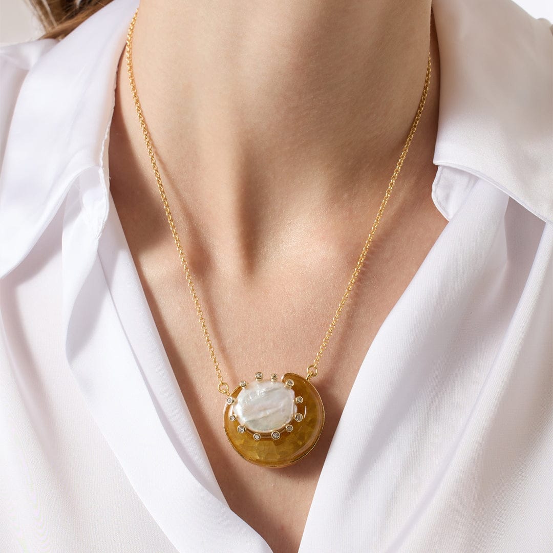 Description: The Nahlira Necklace is inspired by freshwater springs and coastal treasures. It features softly polished beige agate stones paired with irregular baroque pearls, strung on a warm-toned chain. Finished with a lobster clasp, this piece balances texture with quiet elegance. The tone and shape of each stone vary naturally, giving every necklace its own serene rhythm.