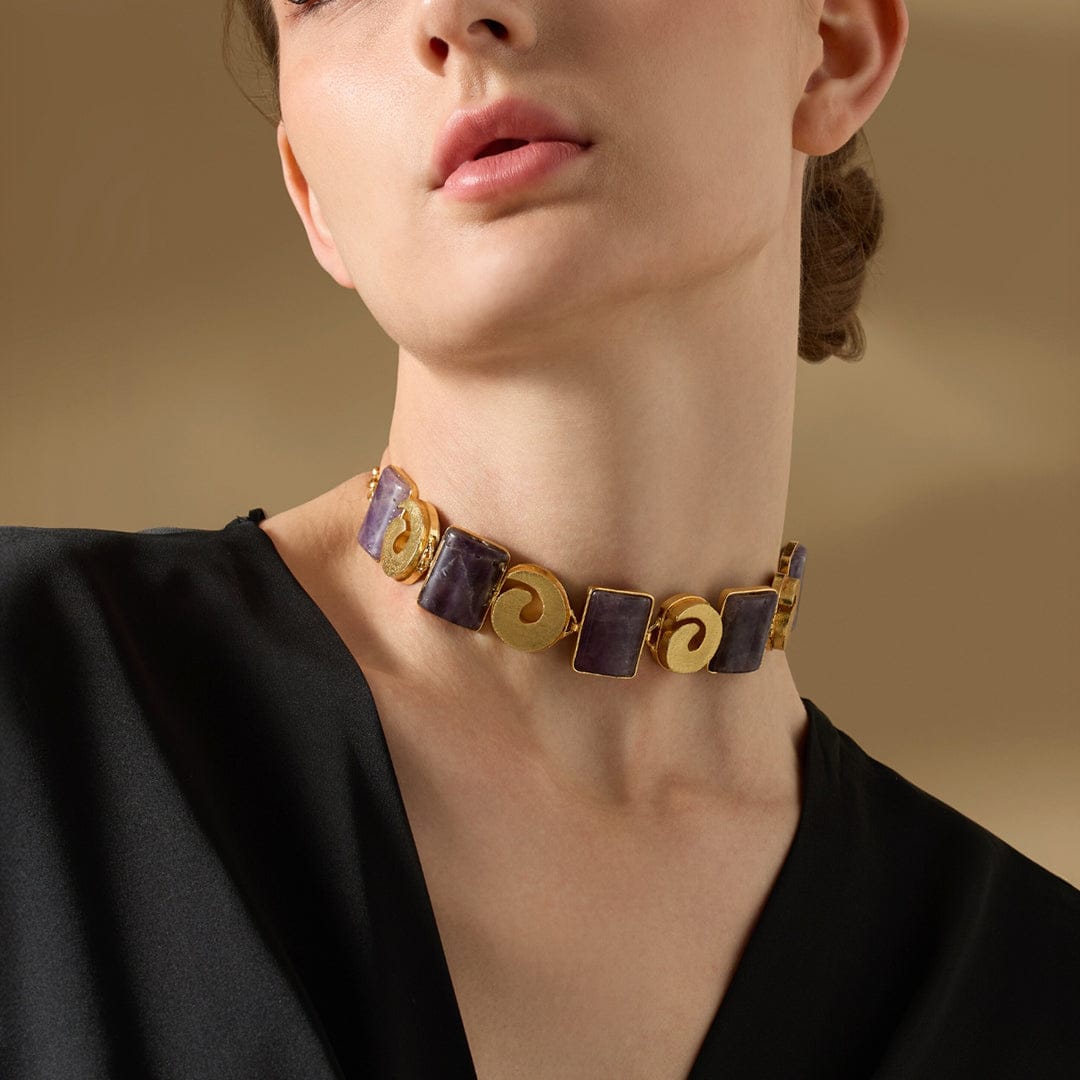 Description: Evoking the mystery of dusk, the Sena Choker showcases purple Agate stones, their deep tones catching the light with subtle brilliance. Set in a choker silhouette, this piece offers a harmonious blend of bold color and graceful form perfect for adding depth to any ensemble. No two stones are exactly alike, offering an organic beauty thats distinctly your own.