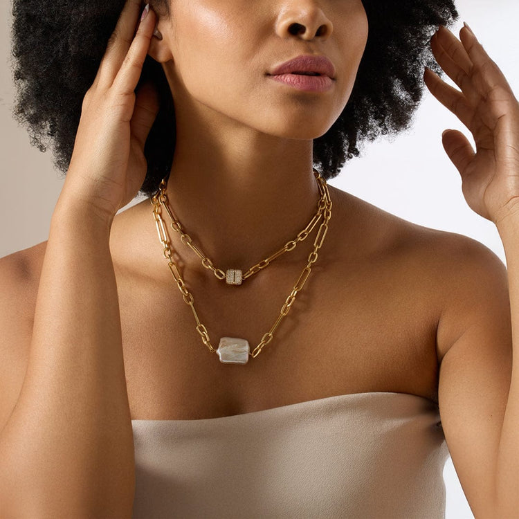 Description: The Uzara Necklace carries the quiet strength of elemental beauty. It features lustrous baroque pearls set between smooth gold-toned connectors, creating a necklace that feels grounded yet fluid. Finished with a magnetic clasp, it layers easily from day to evening. Every pearl holds its own shape and glow, allowing the necklace to tell a story of quiet rarity.