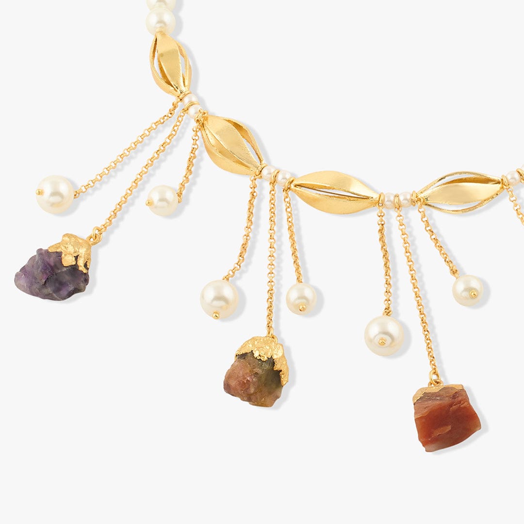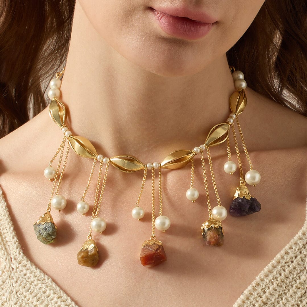Description: The Zenyra Necklace is inspired by light dancing through stained glass. Multicolored quartz stones bloom across a gold-toned chain, catching color from every angle. Secured with a lobster clasp, its a vibrant accent for both day and evening wear. Every quartz stone has its own shade and clarity, making each necklace a vivid original.