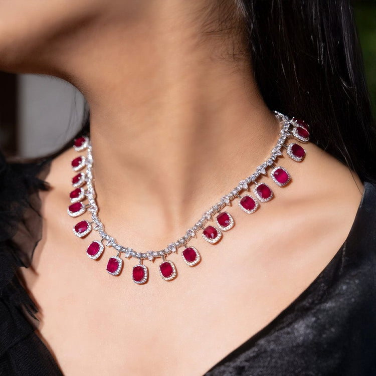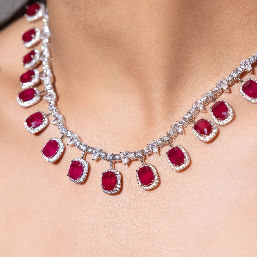 Description: This ruby-toned crystal necklace features a repeating pattern of teardrop motifs in a symmetrical arrangement. Perfect for bridal occasions, receptions, or glamorous evening wear.