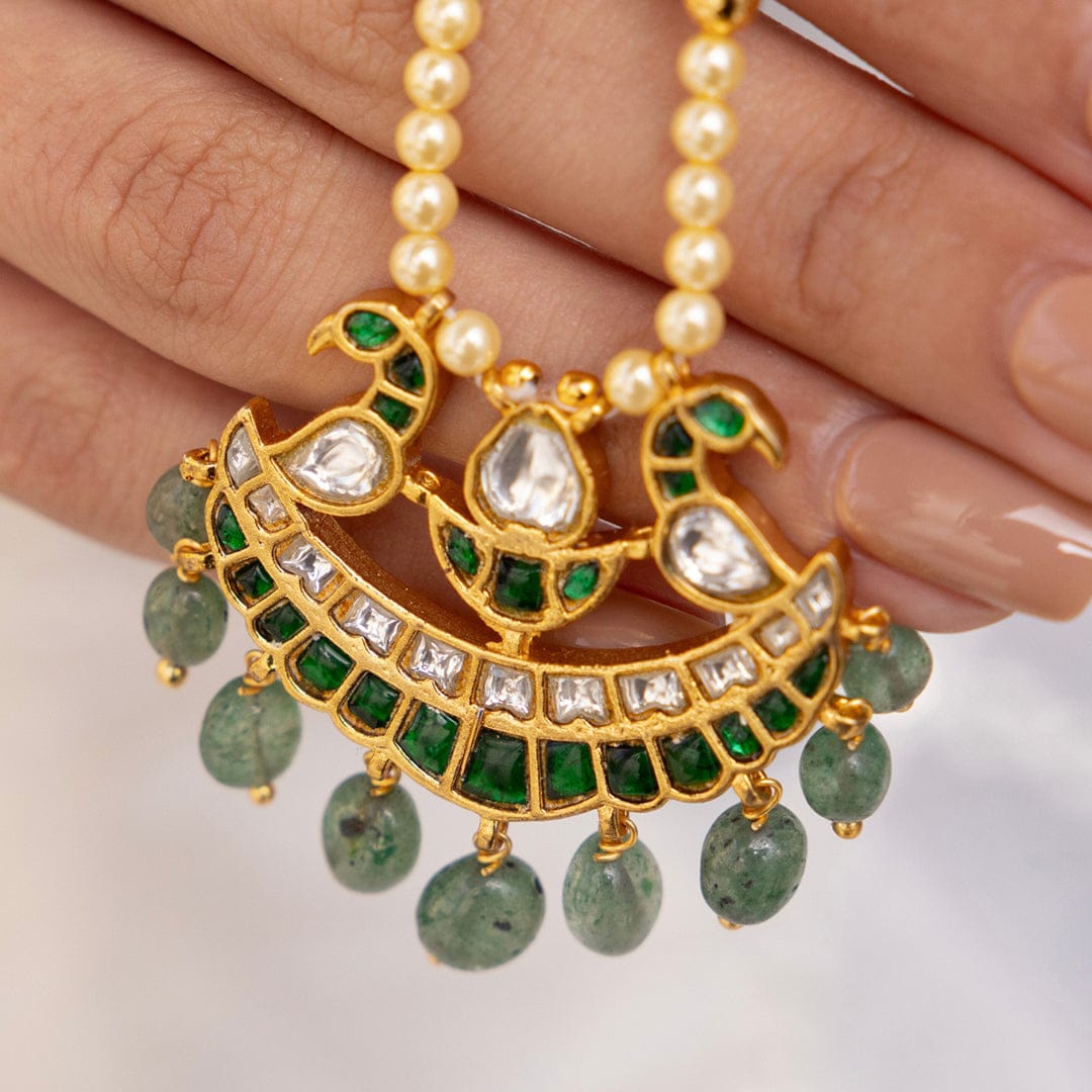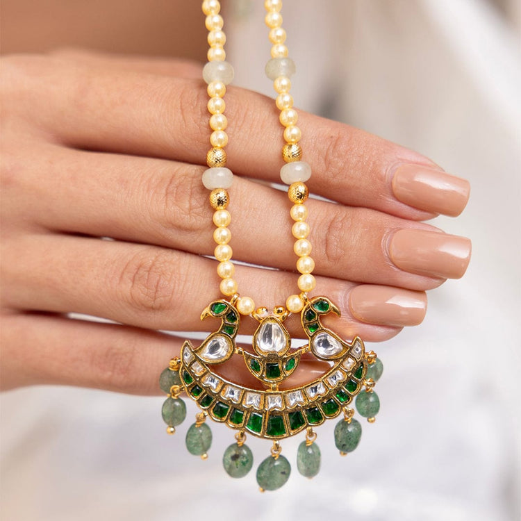 Description: Designed with a palette of yellow, green, and pink beads, this necklace boasts a floral pendant with dangling emerald drops. A vivid celebration of craftideal for haldi or day wedding occasions.