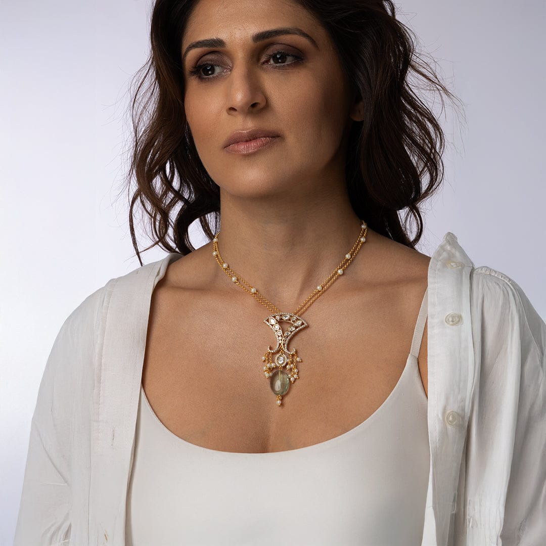 Description: Ornate gold-tone statement necklace featuring a geometric-set top and a large, multifaceted briolette drop on a beaded double chain.