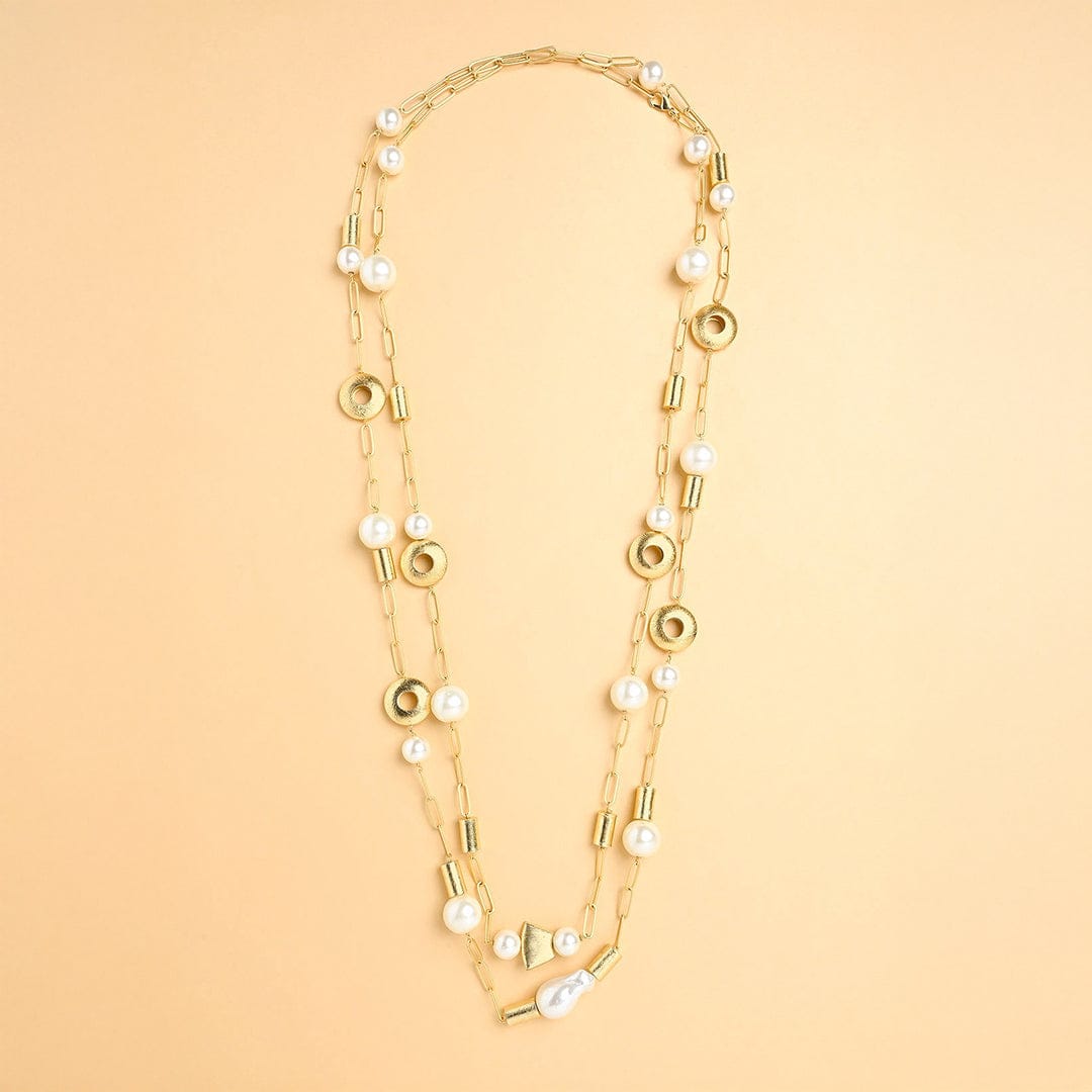 Regular price Rs. 2,850.00Description : Link Chain Pearl Bean Sautoir - Elevate your elegance with this long sautoir, a symphony of pearls and gold chunklets on a linked gold chain. Versatile for denim shirts, maxi dresses, cocktails, and evening gowns. Micron Plating ensures enduring quality.