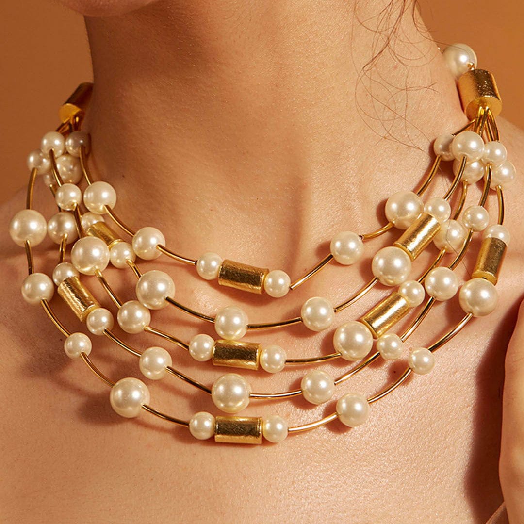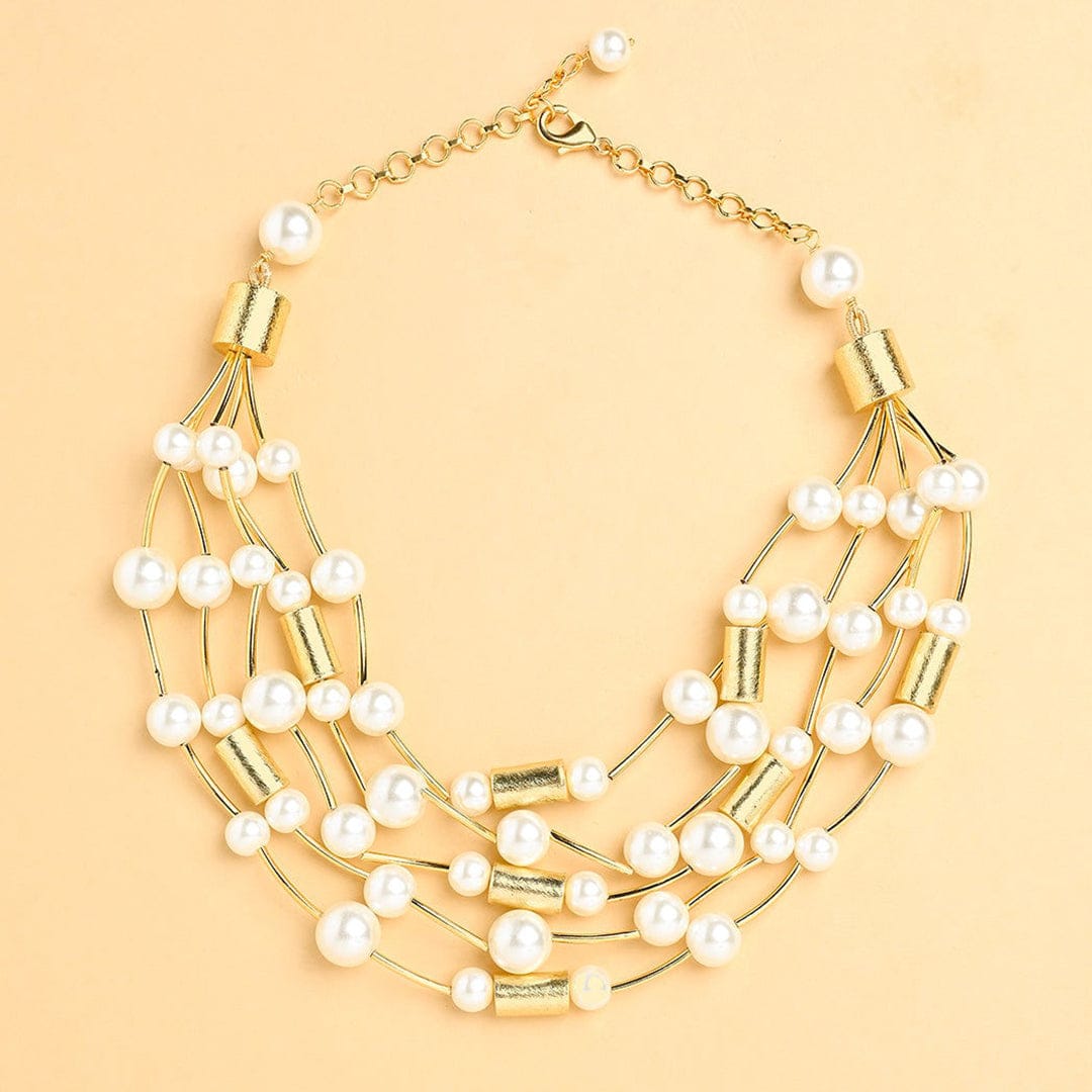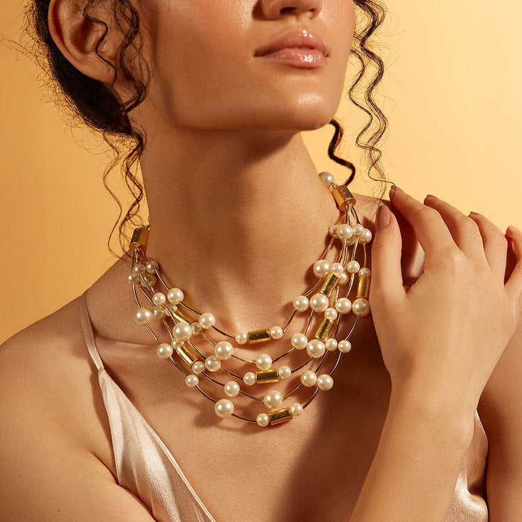 Description : Pearl Multi String Choker - Embrace elegance with a multi-layered necklace featuring white pearls and gold accents for modern luxury. Versatile for denim shirts, maxi dresses, traditional tunics, cocktails, and evening gowns. Micron Plating ensures enduring quality.