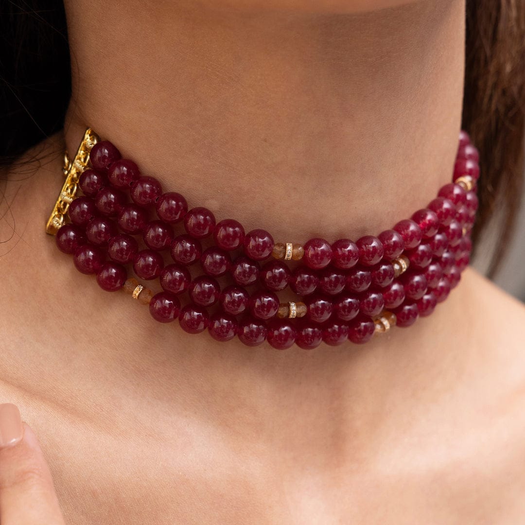 Description: Strung with rich berry-toned beads and highlighted by a soft sheen, this maroon choker is bold yet refined. A beautiful pick for wedding festivities or vibrant festive outfits.