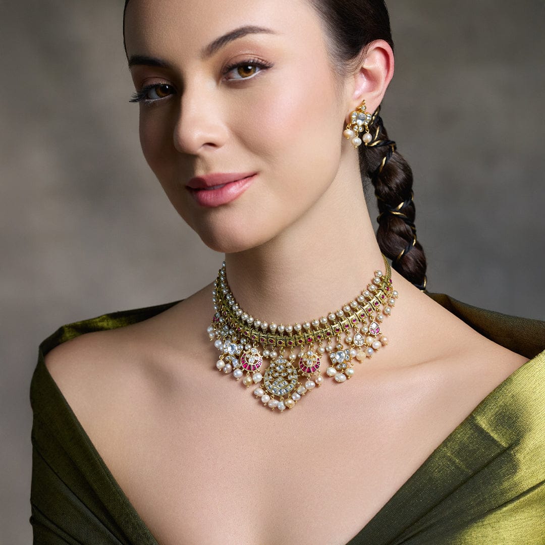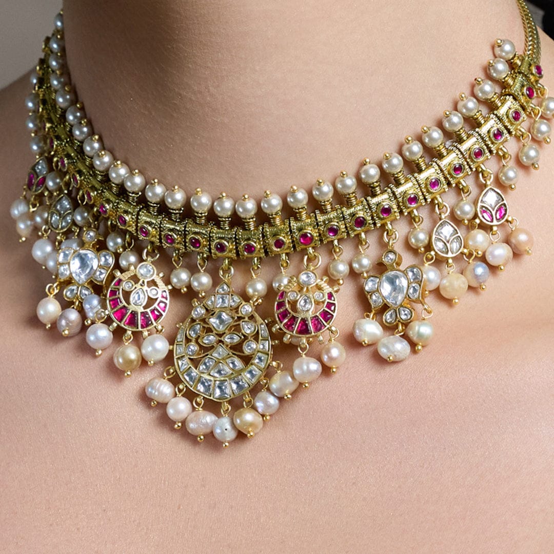 Description: Elevate your look with an elegant golden necklace that adds fine Kundan work with pearls and floral art. A evergreen piece to enhance your traditional outfit.