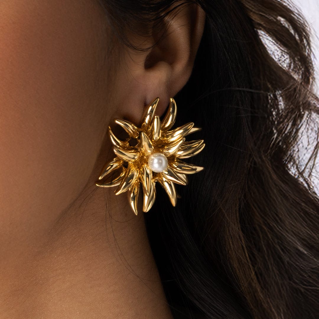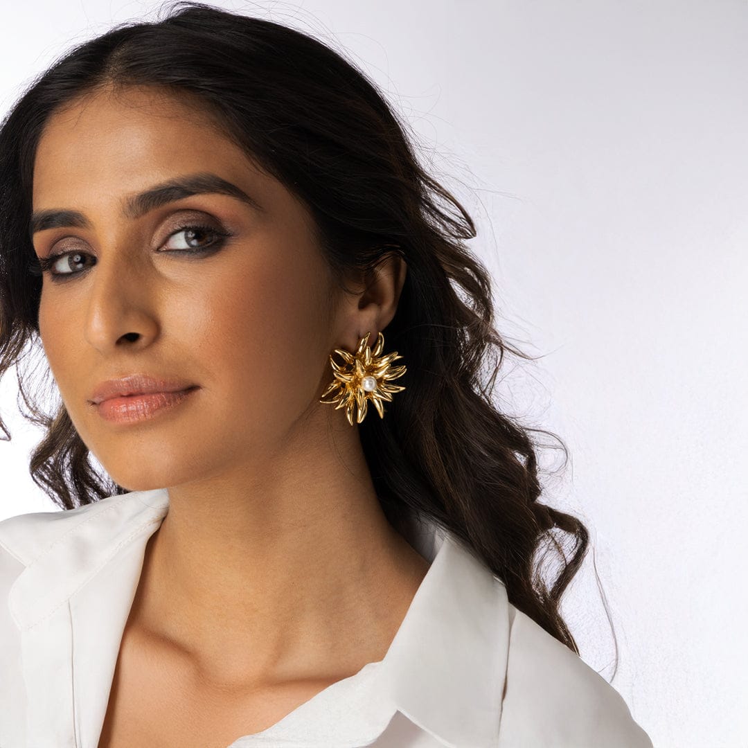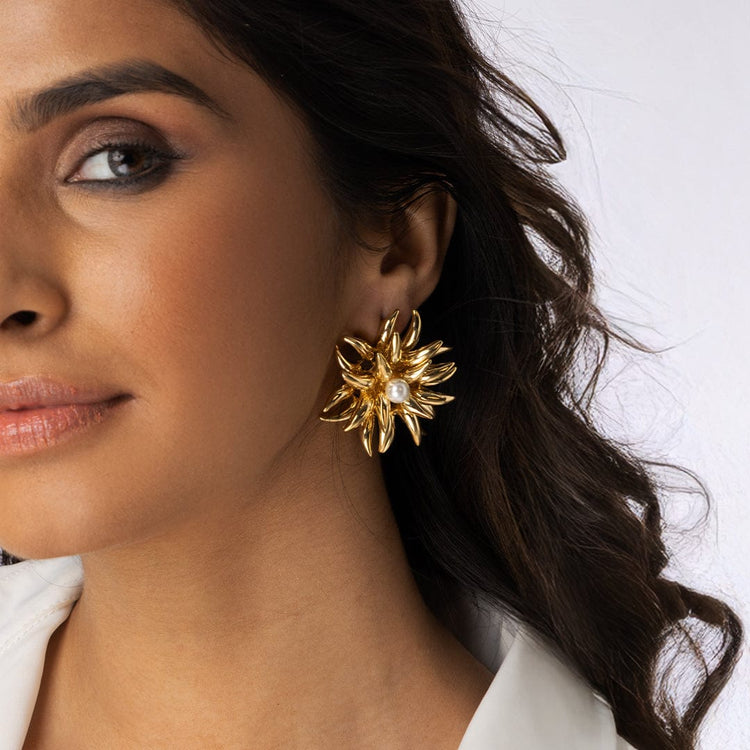 Description: Ahaanya’s golden bloom earrings feature a radiant floral design with a pearl center. Bold, elegant, and eye-catching, they add instant charm to festive and modern outfits..