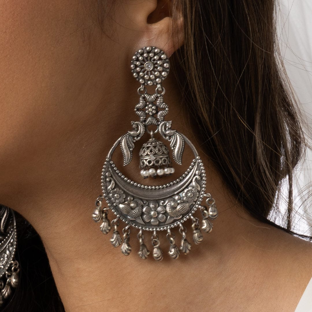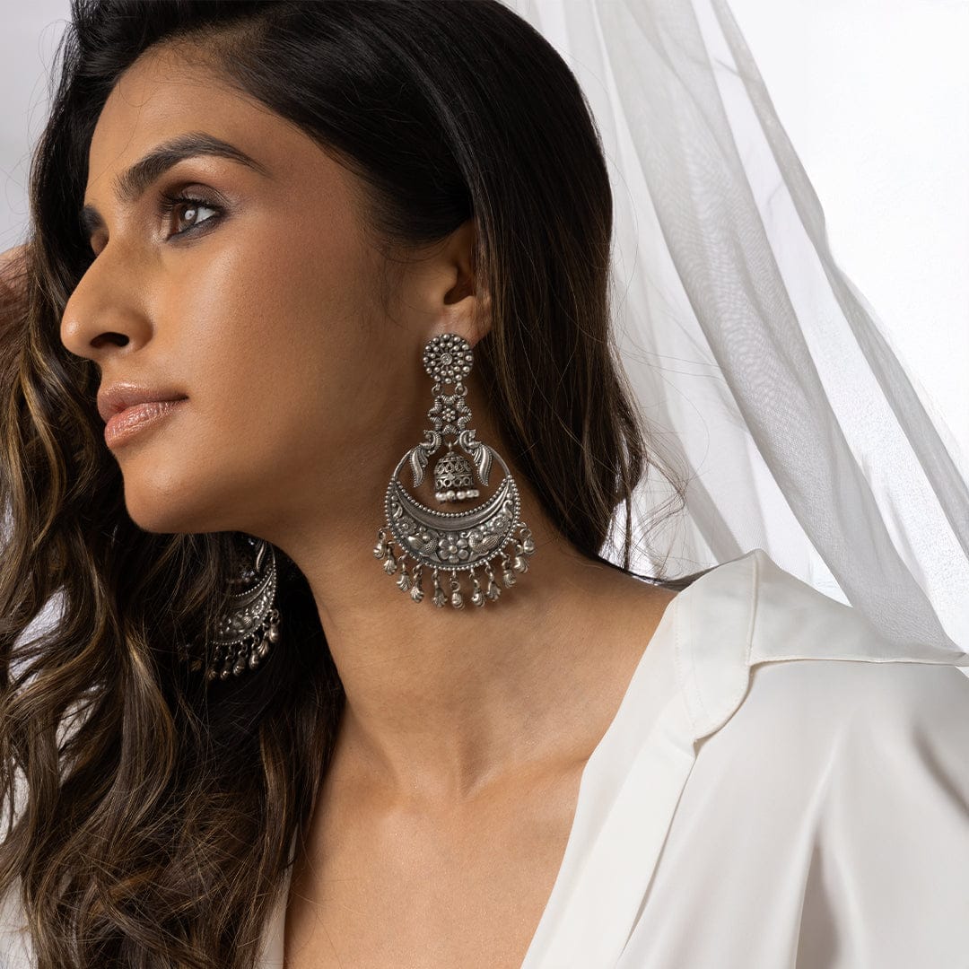 Description: Intricate crescent-shaped earring with detailed engraving and layered hanging droplets, perfect for ethnic outfits, festive styling, and statement looks in online Indian jewellery collections.