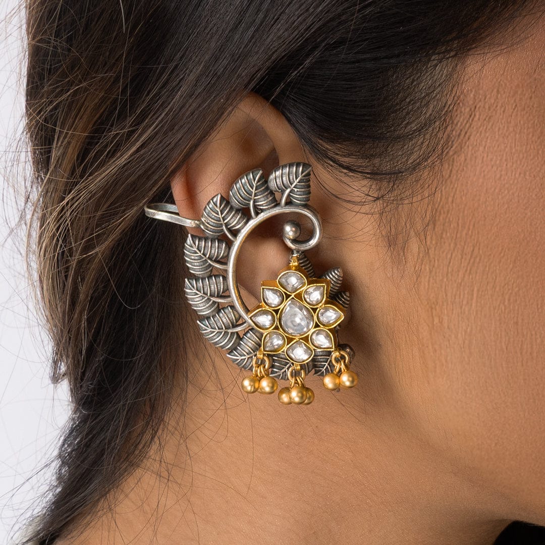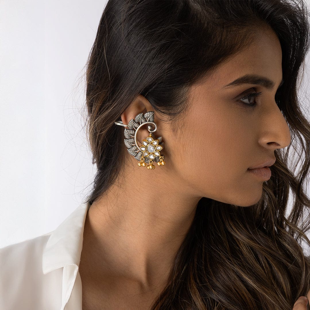 Description: This Indian-style jewellery earring is an ornate cluster stud featuring a delicate, layered floral design. The piece showcases a mix of pale green and white accents from Ahaanya.