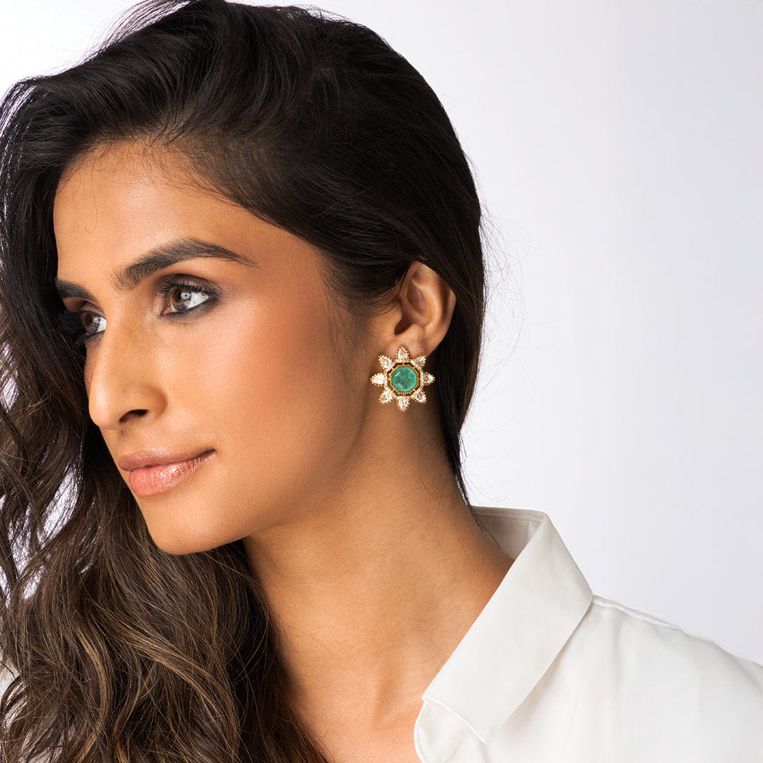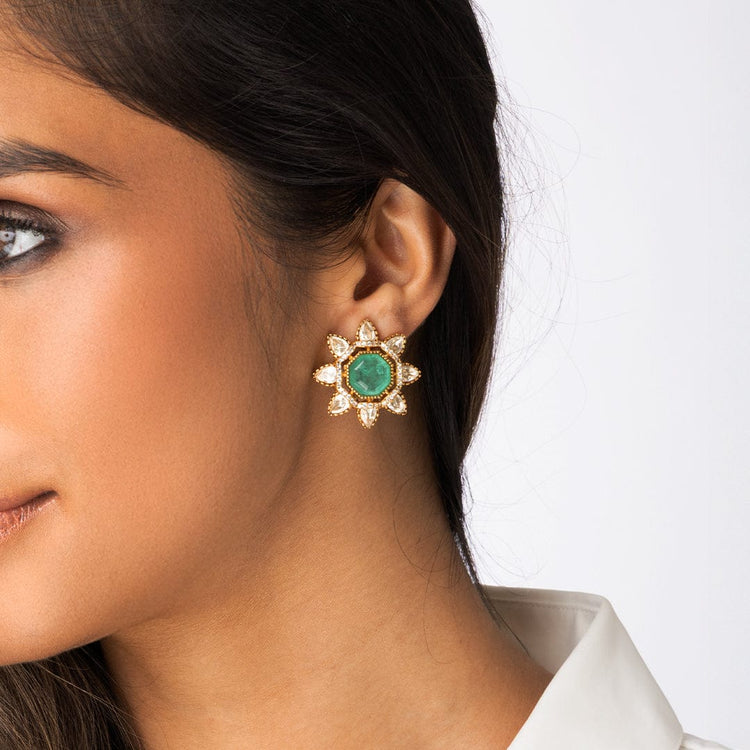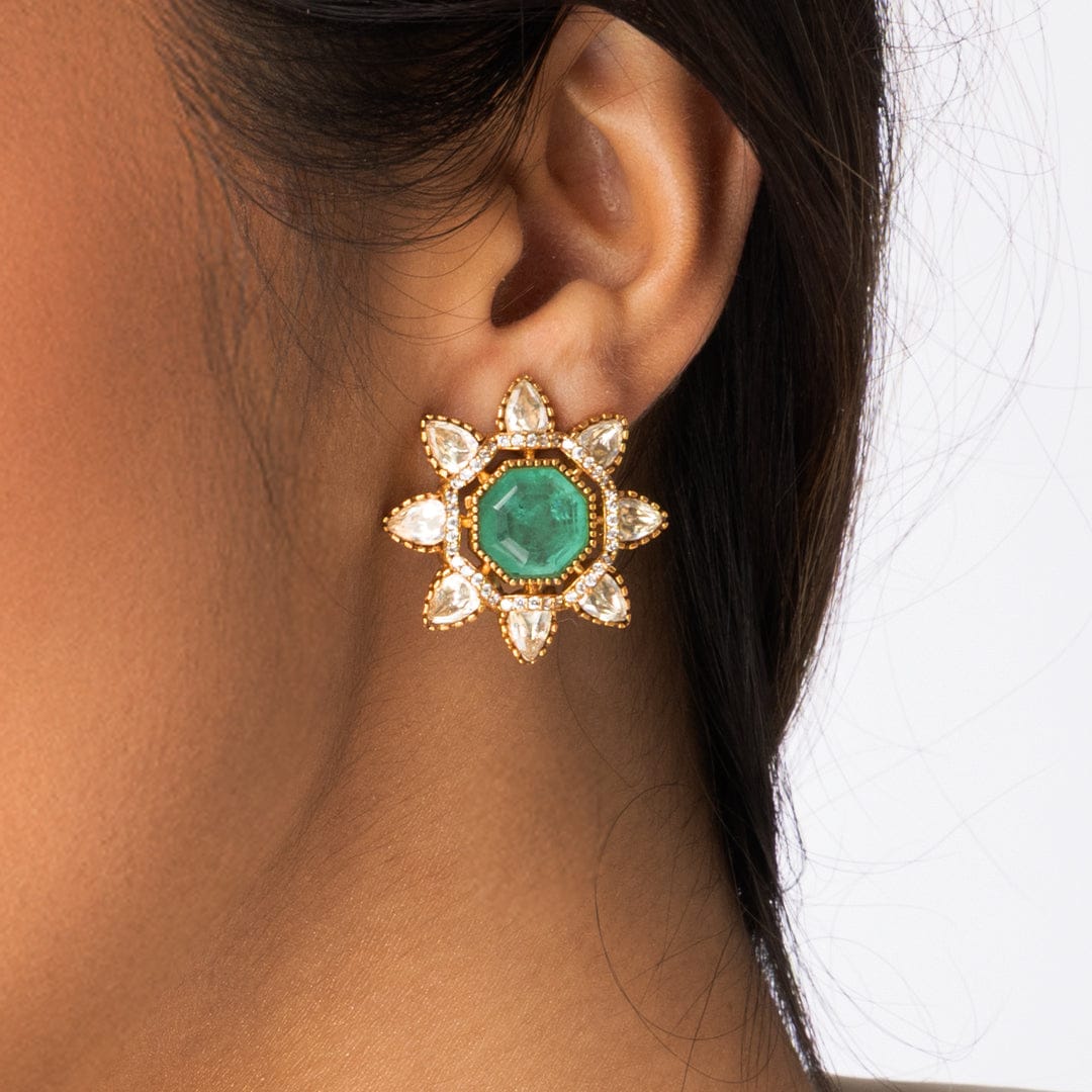 Description: These bold studs feature a large, faceted green stone center surrounded by a striking halo of clear, uncut pear-shaped stones. This dramatic Indian jewellery style is a captivating choice for online Indian jewellery browsing.