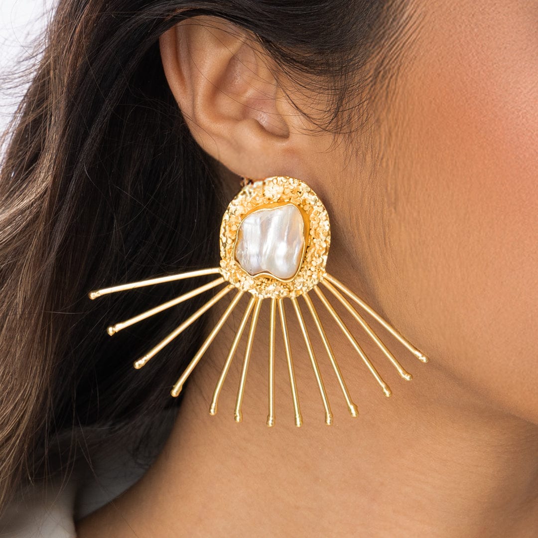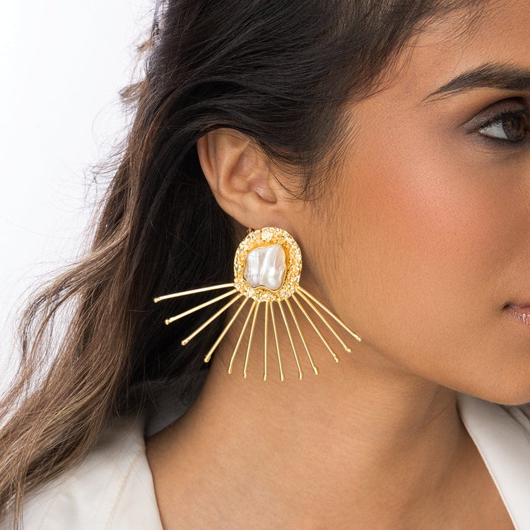 Description: These are large, gold-tone drop earrings with a bold, flat, square-round plaque. They feature a large, smooth, white central stone. Thin metal rods fan out below the plaque, like rays of light, for a dramatic look.