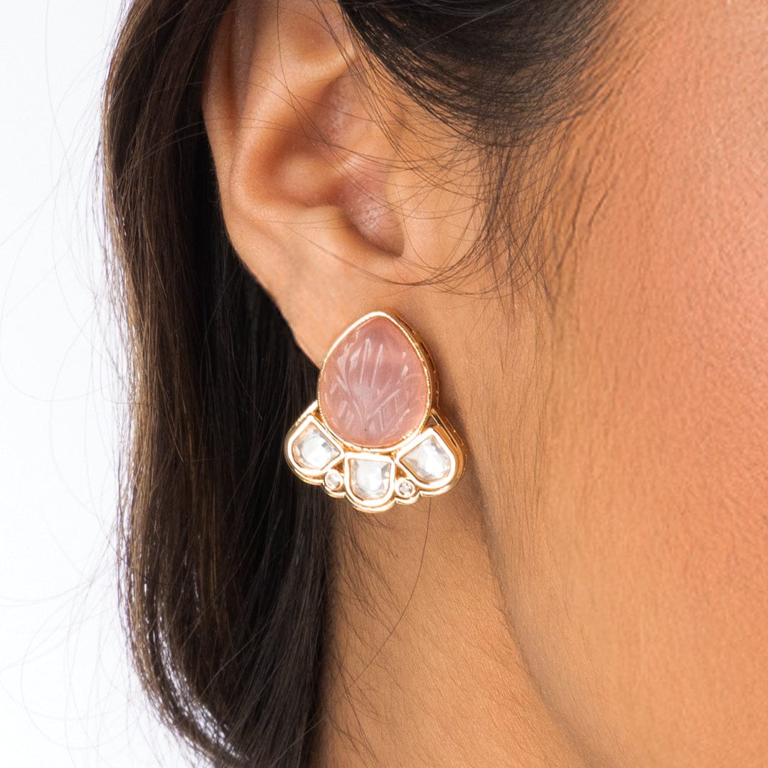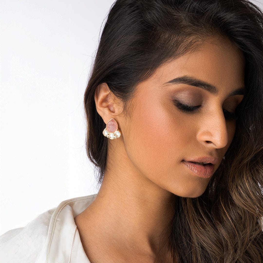 Description: These small stud earrings feature a top stone that is a simple, translucent drop shape. This stone sits atop a layered bottom section with small white accents and a geometric scallop shape. The design is feminine and elegant.